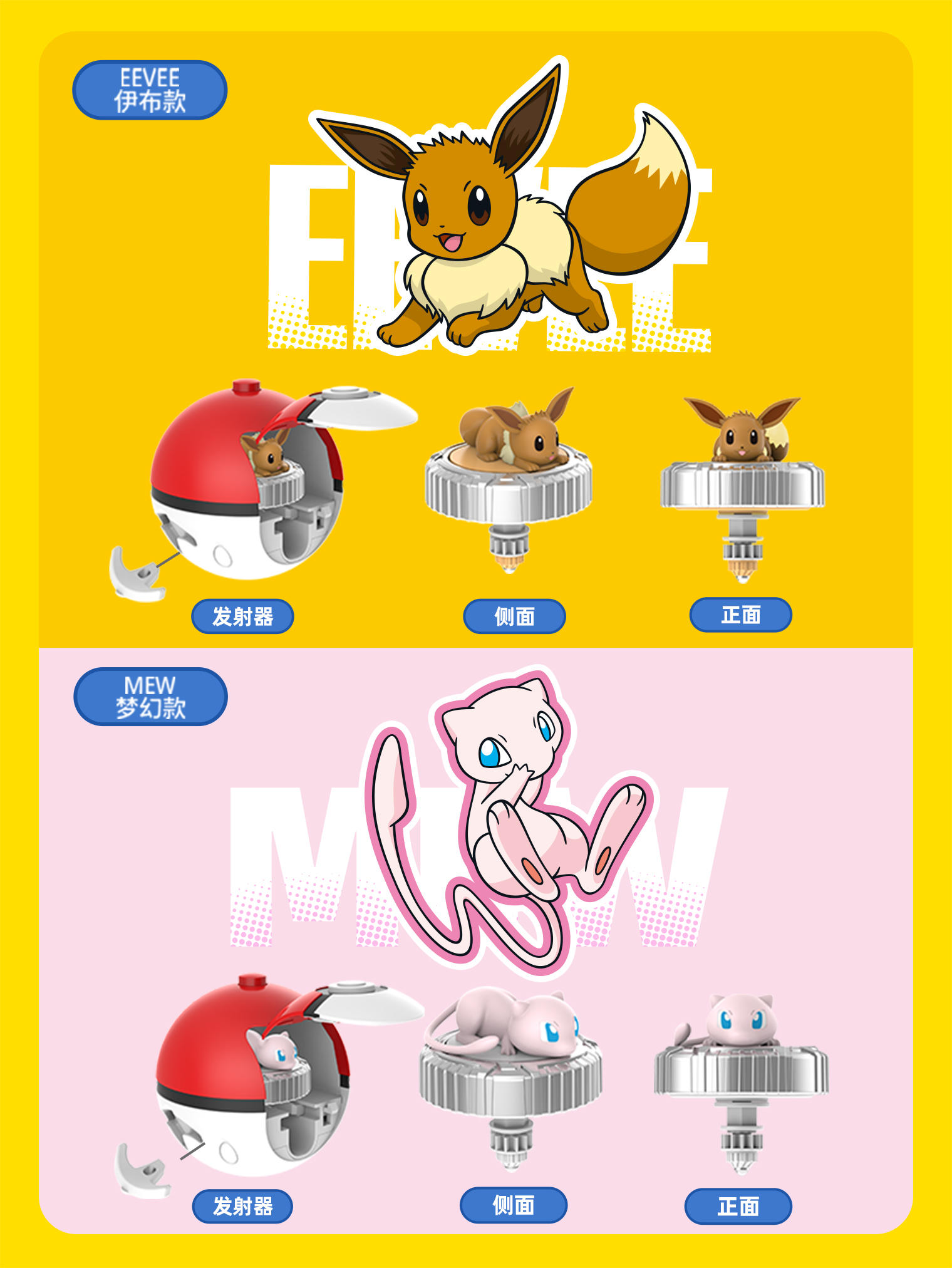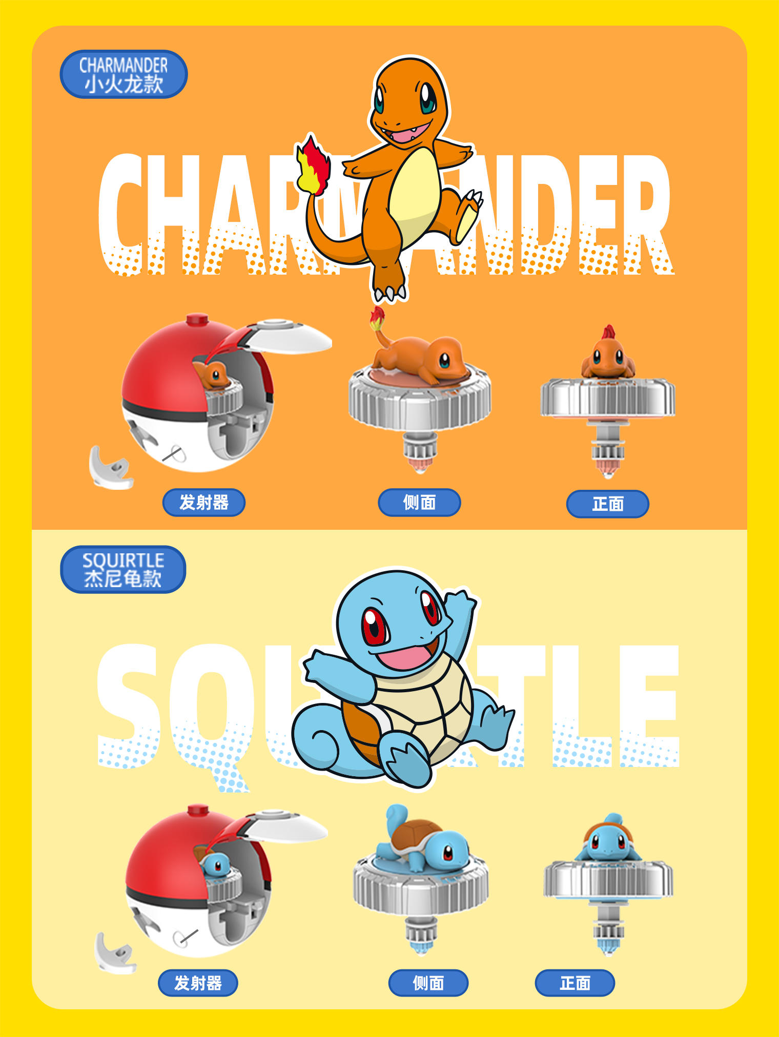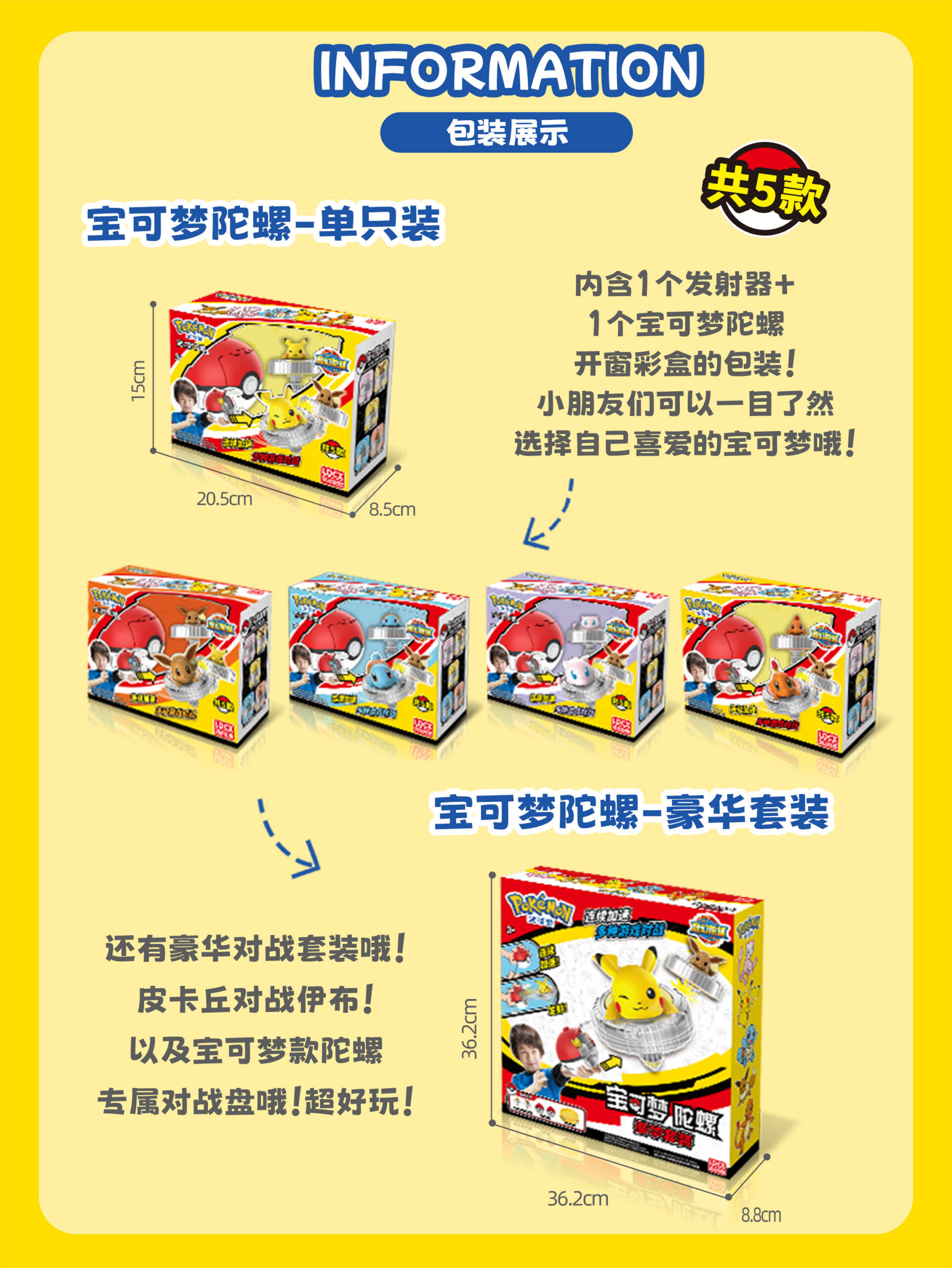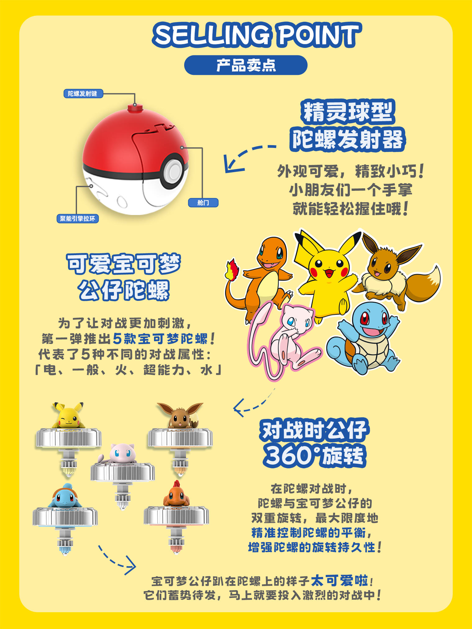 为了让对战更加刺激,第一弹推出5款宝可梦陀螺!代表了5种不同的对战属性:电、一般、火、超能力、水。在陀螺对战时,陀螺上的宝可梦公仔还会360度旋转,陀螺与宝可梦公仔的双重旋转,能最大限度地精准控制陀螺的平衡,增强陀螺的旋转持久性哦!