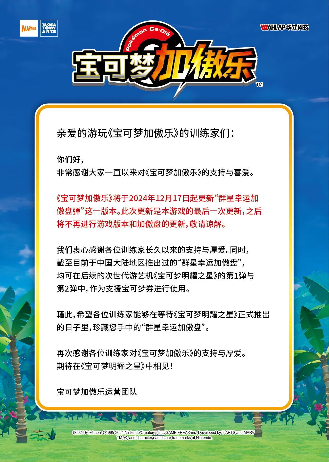 给《宝可梦加傲乐》训练家们!《宝可梦加傲乐》即将进行最后一次更新!
