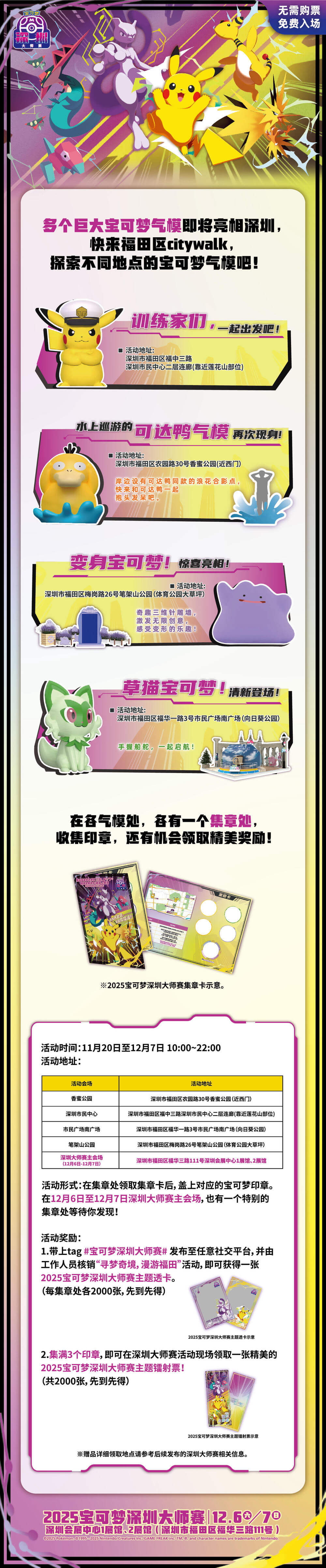 2.带上tag #宝可梦深圳大师赛# 发布至任意社交平台,由工作人员核销“寻梦奇境,漫游福田”活动,即可获得一张“2025宝可梦深圳大师赛主题透卡”。(每集章处各2000张,先到先得)