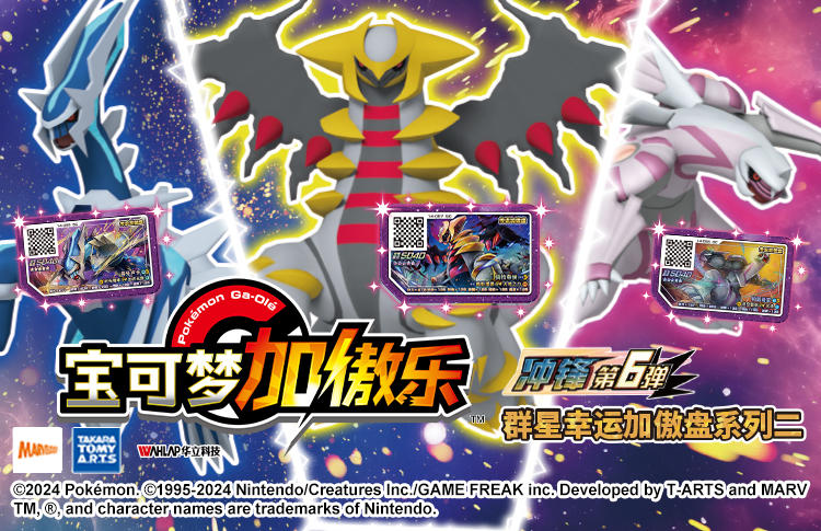 | 发售日 | 全新《宝可梦加傲乐》冲锋第6弹 “群星幸运加傲盘”系列二! 今日起于全国各大电玩城上新啰! 传说的宝可梦“骑拉帝纳”“帝牙卢卡”“帕路奇亚”强力登场! 实力强大的它们还可使用双重冲锋!接连使出2种不同招式带给对手沉重打击! 此外,还有可使用Z招式的“凤王”“洛奇亚”与可使用冲锋连击的“大竺葵”“火暴兽”“大力鳄”等多数宝可梦于本弹中登场!高人气的“皮卡丘”以及传说的宝可梦“索尔加雷欧”“露奈雅拉”等共13张全新的“群星幸运加傲盘”等你收藏! 谁将成为超级幸运儿!还会有其他好事发生? 身为训练家的你不容错过哦!准备好你的队伍与宝可梦们进行激烈的连打挑战! 捕获宝可梦后,获得加傲盘吧! |