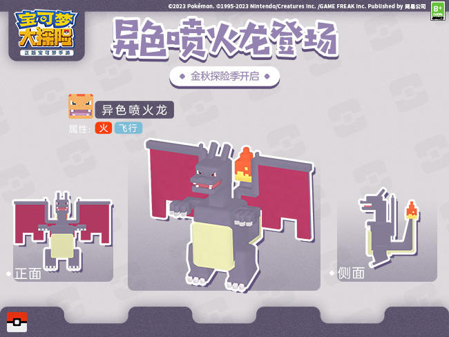 与无极汰那一同亮相的还有异色喷火龙,作为高人气宝可梦喷火龙的异色版,异色喷火龙拥有火与飞行两种属性,强大的进攻能力无论何时都是探险家们在方可乐岛的得力助手,将其收服之后与它一起快乐冒险吧!