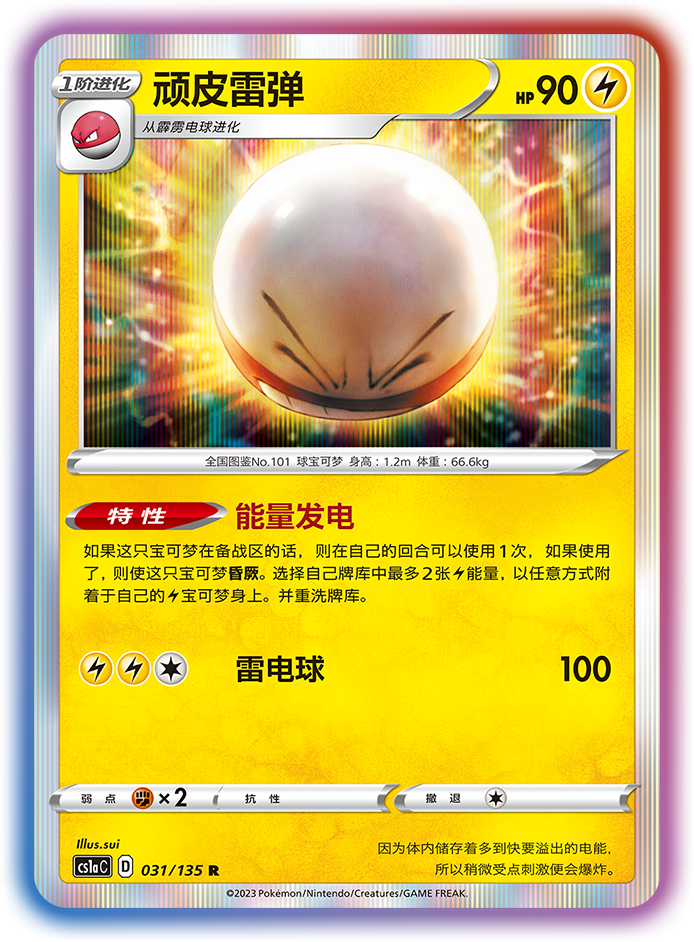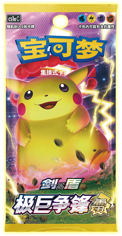 补充包【雷】收录了水、雷、超、斗属性的宝可梦以及配套使用的训练家卡牌。超极巨化的皮卡丘作为封面宝可梦将在补充包【雷】中登场。