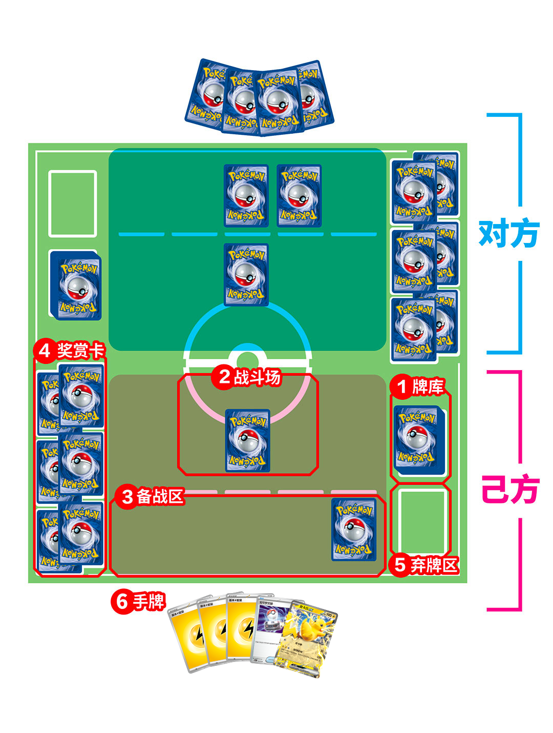 - 将自己的卡组反面朝上,放于牌库区。自己每个回合的开始,以及因为宝可梦招式的效果、训练家卡的效果等,可以从牌库抽取卡牌。