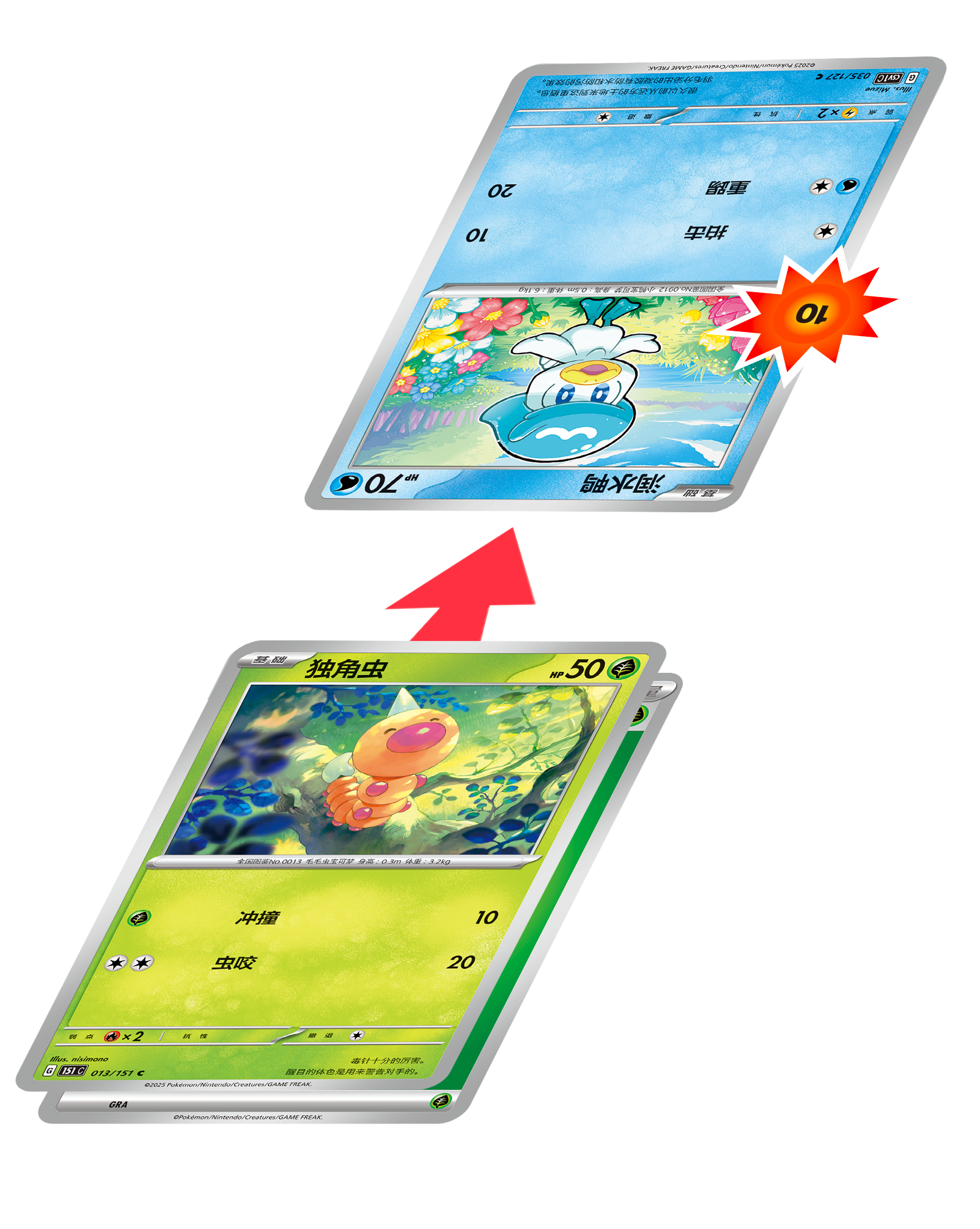 如上图所示,独角虫对润水鸭使出了“冲撞”后,会造成10点伤害。所以需要将1个“10”的伤害指示物放置于润水鸭身上。