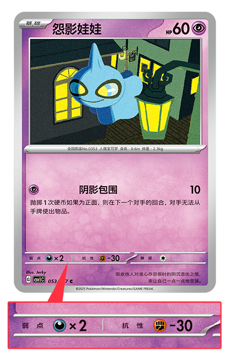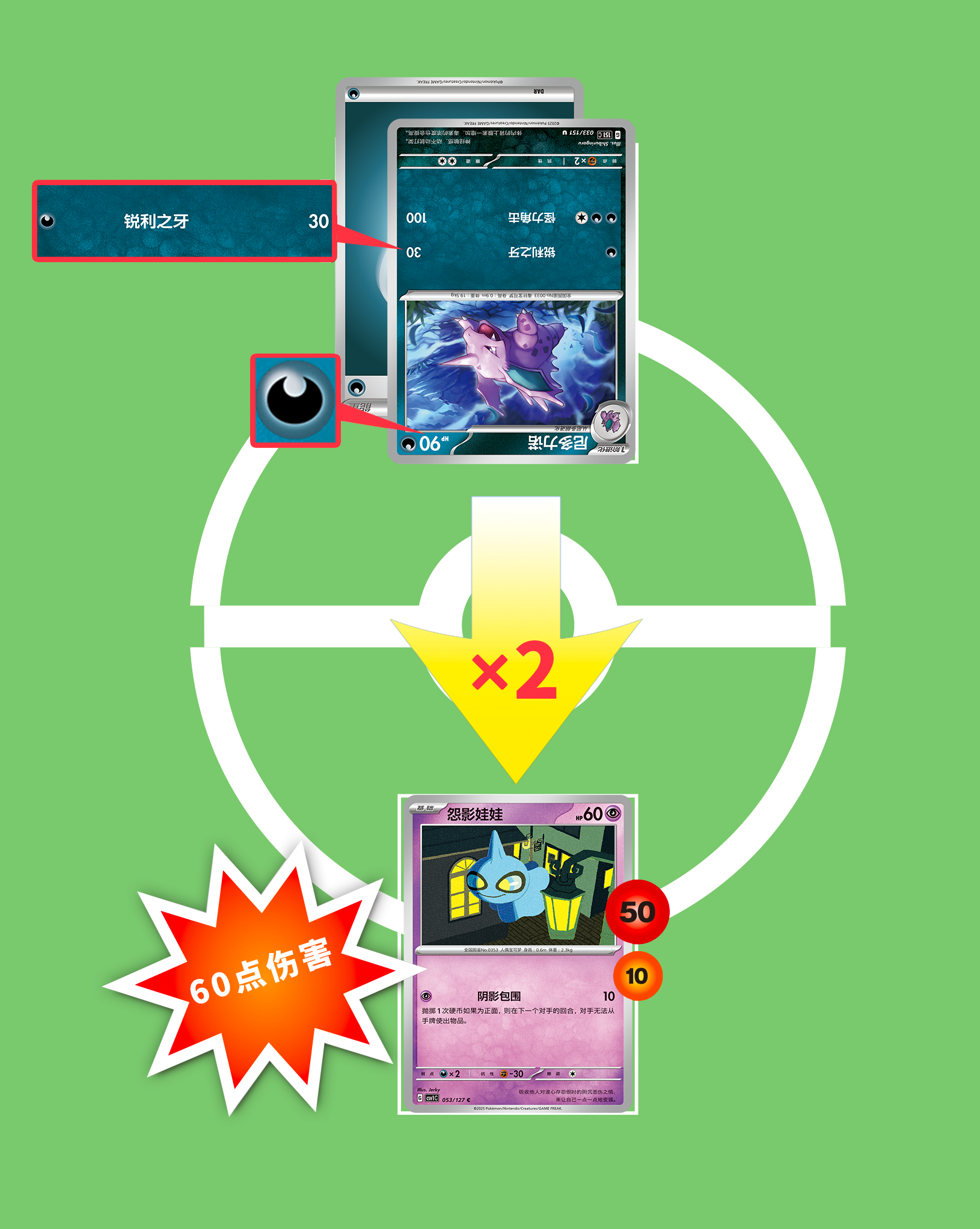 当这只怨影娃娃受到来自恶属性的尼多力诺的招式“锐利之牙”时,其伤害会变为2倍。所以需要将6个“10”的伤害指示物,或1个“50”的伤害指示物加上1个“10”的伤害指示物放置于怨影娃娃身上。
