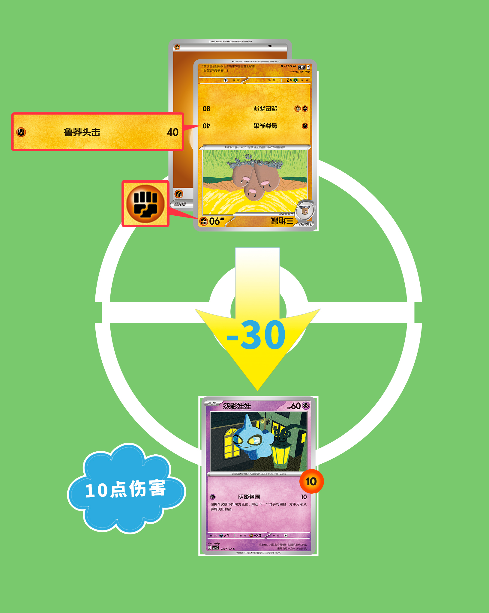 而当这只怨影娃娃受到来自斗属性的三地鼠的招式“鲁莽头击”时,其伤害将会减少30。所以只需要将1个“10”的伤害指示物放置于怨影娃娃身上即可。
