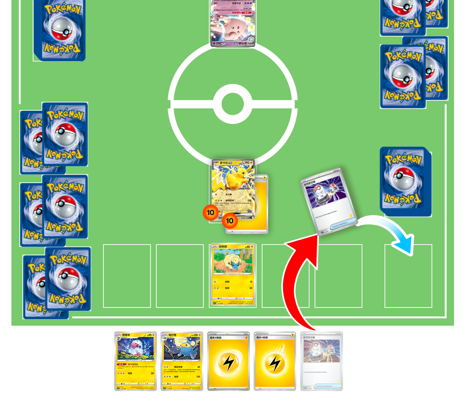 注:撤退时需将附着于战斗宝可梦身上的,相应个数的撤退所需能量放于弃牌区后才可进行撤退。若备战区中没有宝可梦,则无法进行撤退。