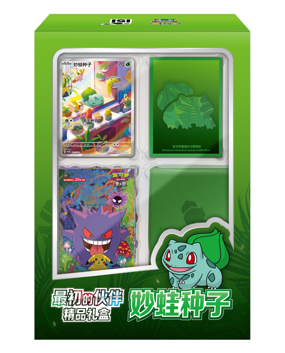 礼盒中还收录了妙蛙种子主题的艺术卡套和卡牌收纳盒,以及1盒“收集啦151 惊”(20张装)补充包。