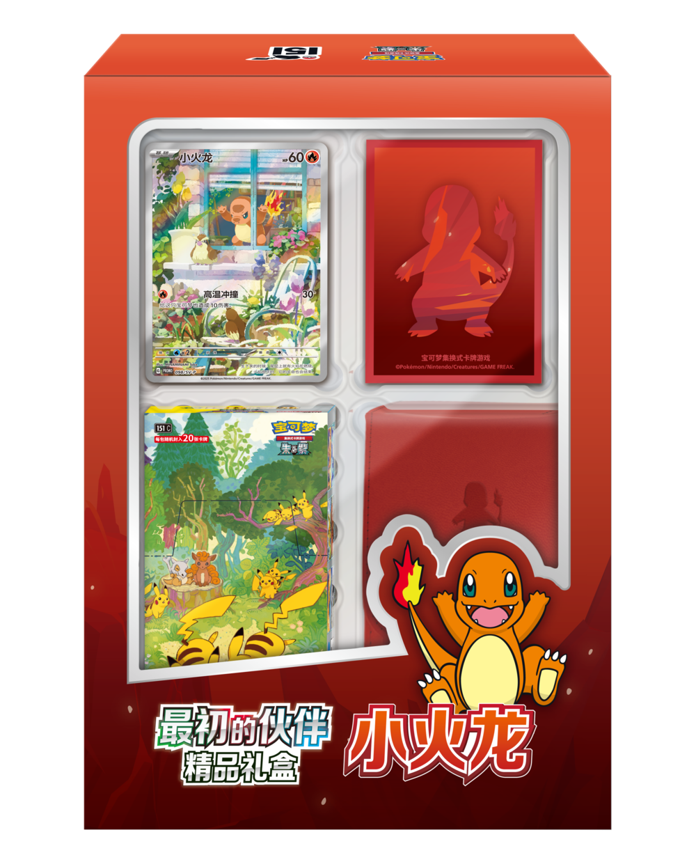 礼盒中还收入了小火龙主题的艺术卡套和卡牌收纳盒,以及1盒“收集啦151 聚”(20张装)补充包。