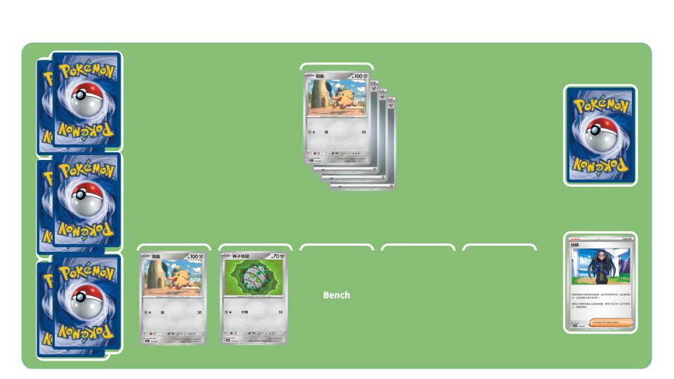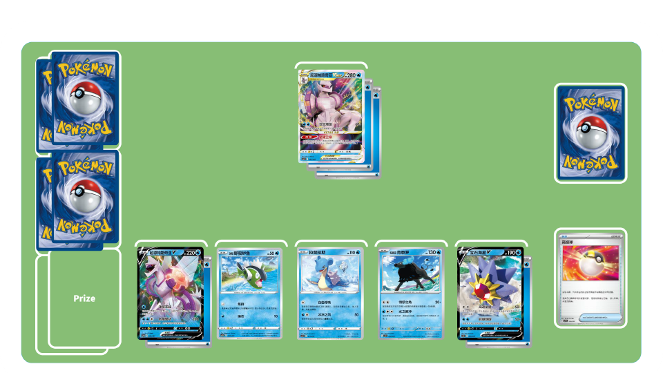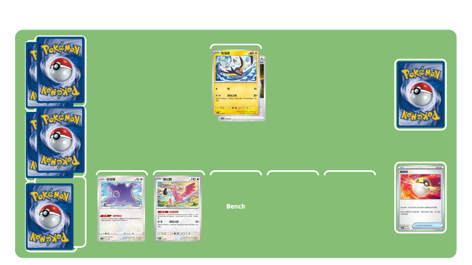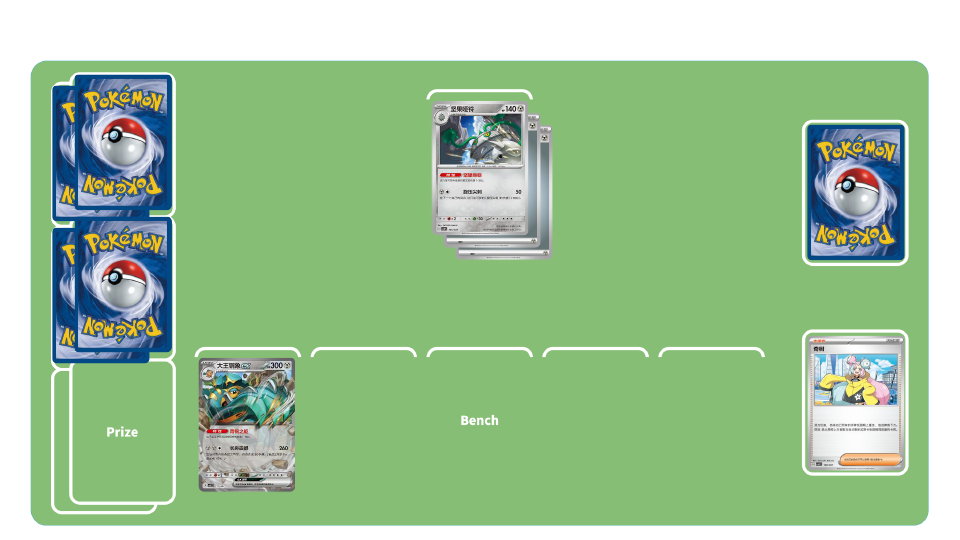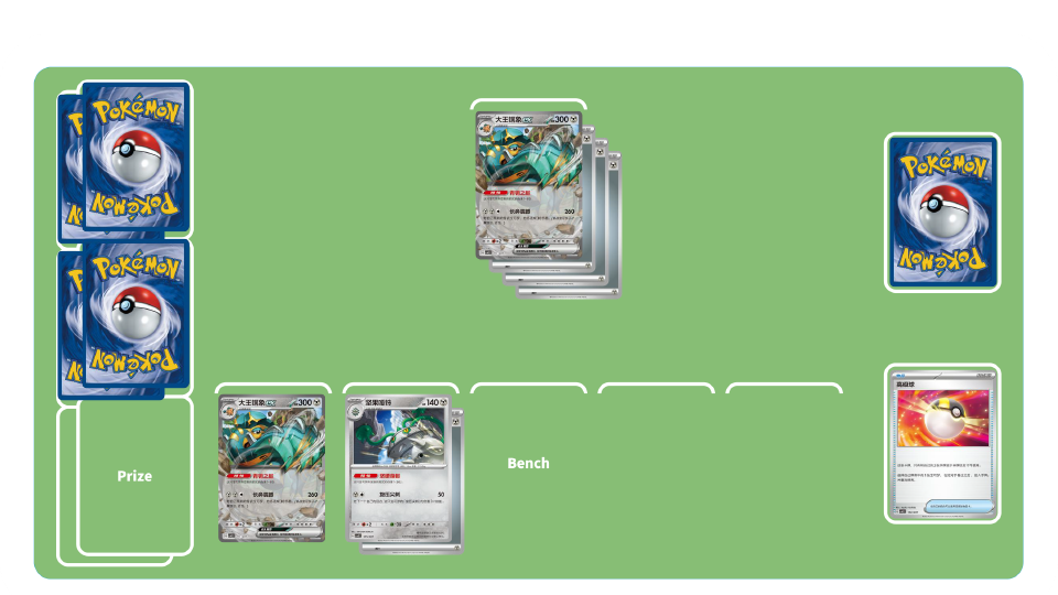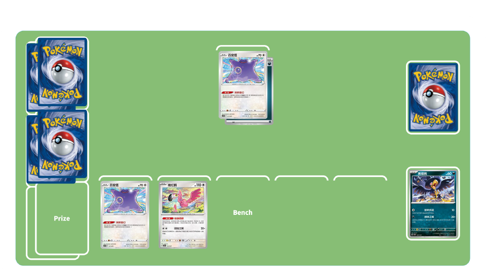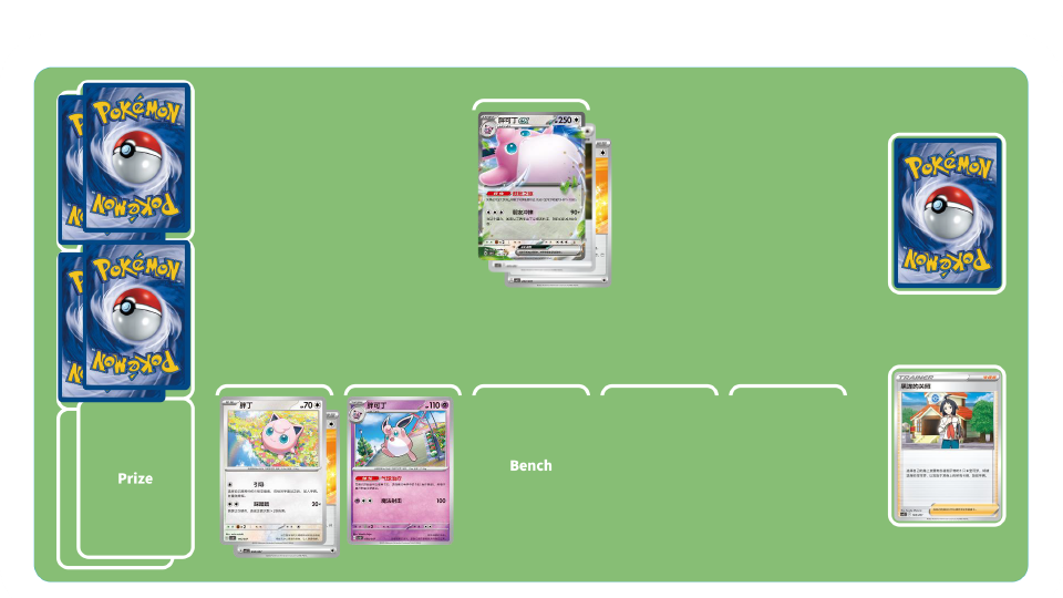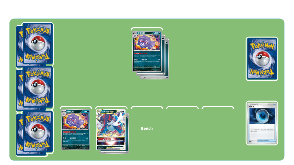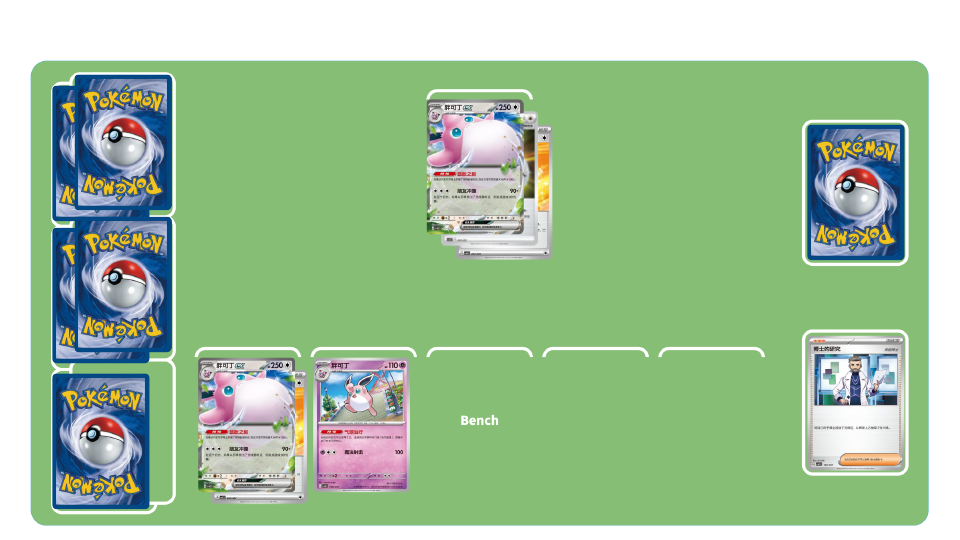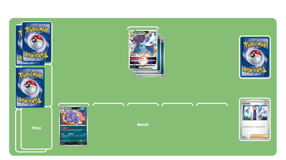 团结之翼卡组-初期:使用训练家卡“高级球”“博士的研究”等累积弃牌区中拥有招式“团结之翼”的宝可梦数量。