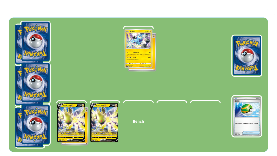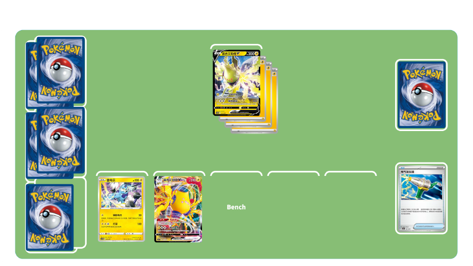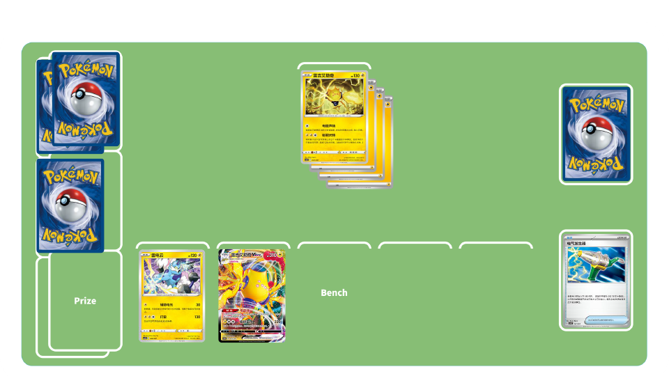 毫不停息的雷霆卡组-初期:进化宝可梦,同时积攒宝可梦身上的雷能量。尽快进化出雷吉艾勒奇VMAX,提升场上基础雷属性宝可梦的招式伤害。发动凌厉攻势,掌控胜负关键!在游戏初期积极地使用各种物品卡,以及竞技场卡“风暴山脉”,在备战区放下宝可梦。雷电云既可以帮助附着能量,又可以造成不俗的伤害。同时物品卡“电气发生器”,也有机会加速附着“雷”能量。