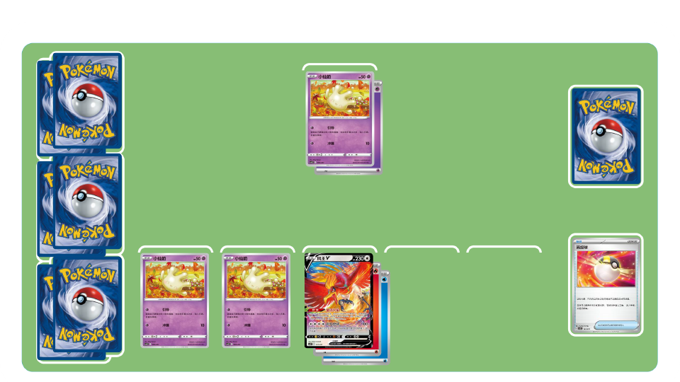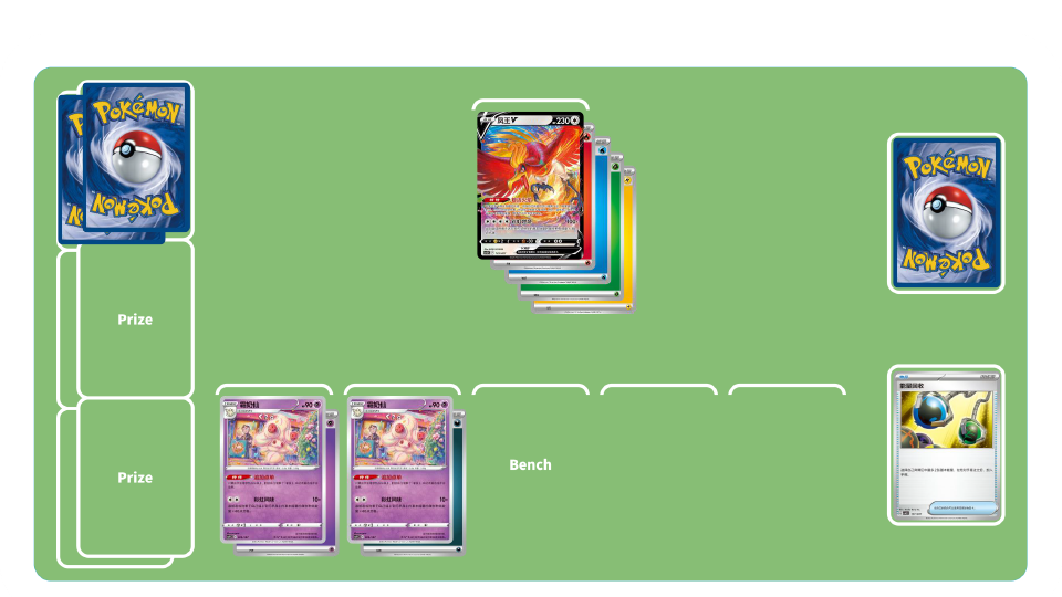 凤王的彩虹燃烧-初期:使用物品卡“高级球”“等级球”“巢穴球”将更多的宝可梦放于备战区。如果可以使用弃牌区中凤王V的特性“复活火焰”,并附着大量能量的话,也是个不错的选择!