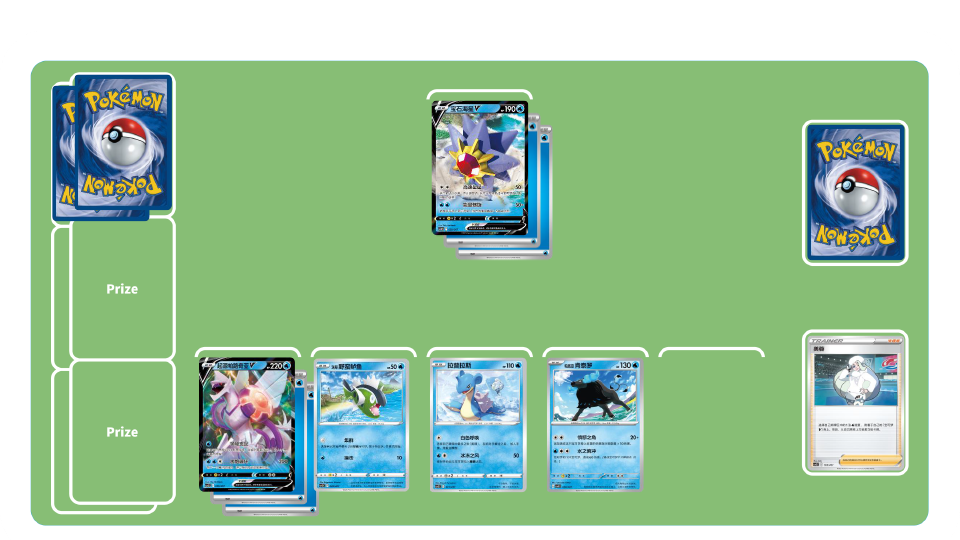 亚空的惊风骇浪卡组-初期:培养更多的宝可梦,将能量更多地放到弃牌区吧!起源帕路奇亚VSTAR是绝对的核心,使用好其招式和VSTAR力量将是制胜关键。在游戏初期积极地使用各种物品卡,在备战区放下宝可梦。备战宝可梦的数量越多,招式“亚空潮漩”的伤害就越高!支援者卡“珠贝”可以把牌库中的物品卡和水属性宝可梦各1张加入手牌。在最初的回合,可以选择物品卡“对战会员通行证”加入手牌,将更多的宝可梦放于备战区。洗翠野蛮鲈鱼的招式“集群”无需能量,就能将2张基础宝可梦放于备战区。