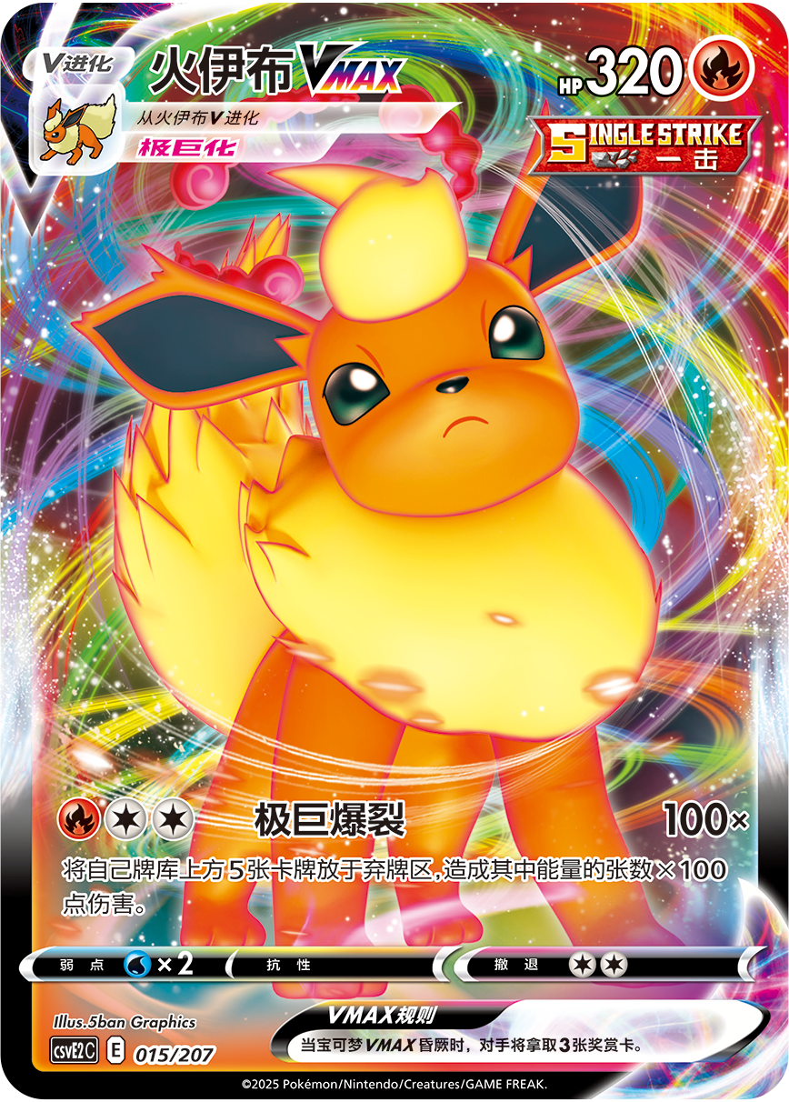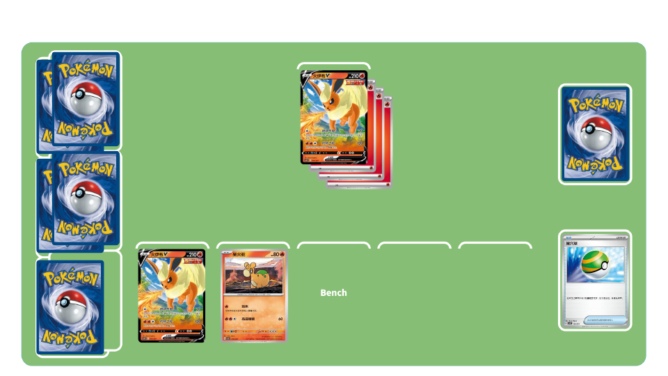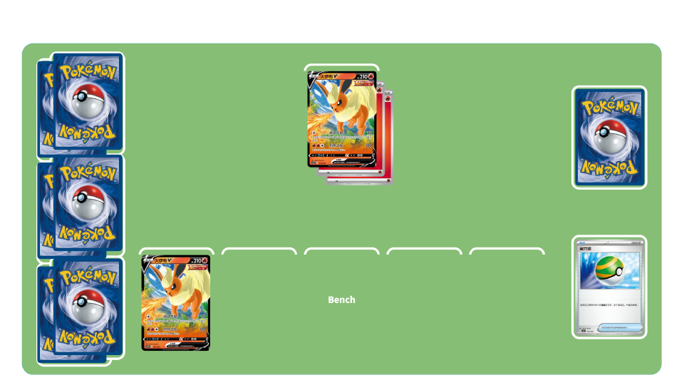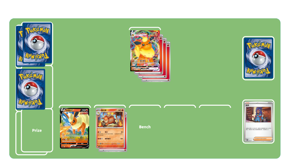 使用竞技场卡“熔岩瀑布之渊”的效果,给备战区的火属性宝可梦附着火能量,使用支援者卡“蕾荷”增加牌库上方基本能量张数,让火伊布VMAX和喷火驼造成高伤害。火伊布VMAX的招式“极巨爆裂”能将自己牌库上方5张卡牌放于弃牌区,造成其中能量的张数×100。喷火驼的招式“喷火”能让双方各将牌库上方1张卡牌放于弃牌区,追加造成其中能量张数×100伤害。