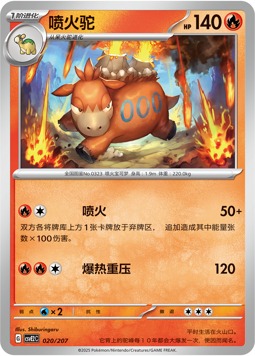 “一击”的爆裂喷火卡组-中期:使用训练家卡把呆火驼加入手牌,在备战区放下呆火驼。使用火伊布V的招式“灼热之柱”给对方宝可梦造成伤害。