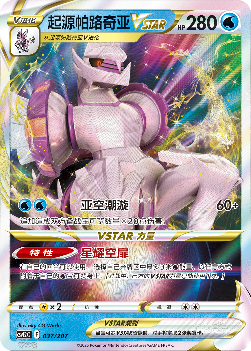 起源帕路奇亚VSTAR的招式“亚空潮漩”会追加造成双方备战宝可梦数量x20的伤害,因此在备战区铺下更多的宝可梦吧!其VSTAR力量“星耀空扉”能将弃牌区种最多3张“水”能量,附着给自己的水宝可梦。尽快将“水”能量放置于弃牌区,并使用VSTAR力量,发起猛烈进攻吧!