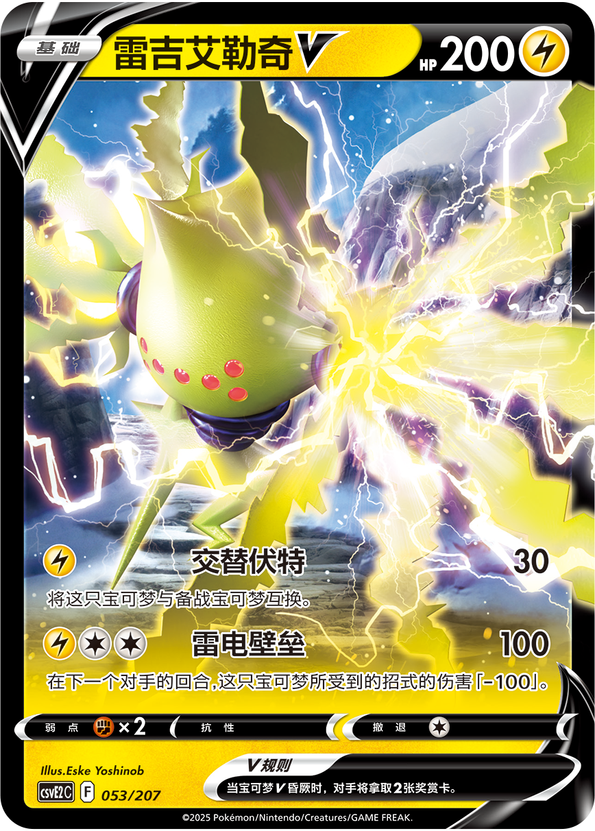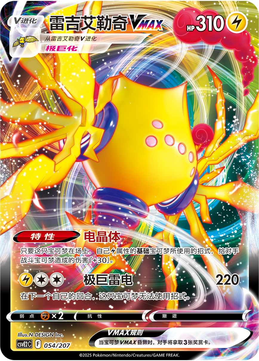 雷吉艾勒奇VMAX本身的招式“极巨雷电”能造成可观的伤害,而其特性“电晶体”还可以增加基础雷属性宝可梦的伤害,可以称得上是进攻辅助两不误。“风暴山脉”可以从自己的牌库快速找到1只基础雷属性宝可梦放于备战区,在场上尽量多地放置雷属性宝可梦。
