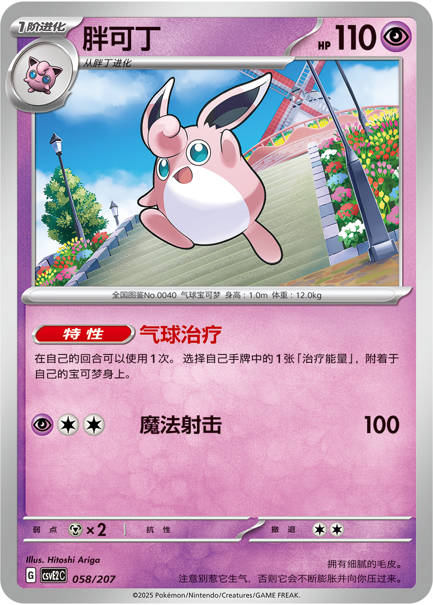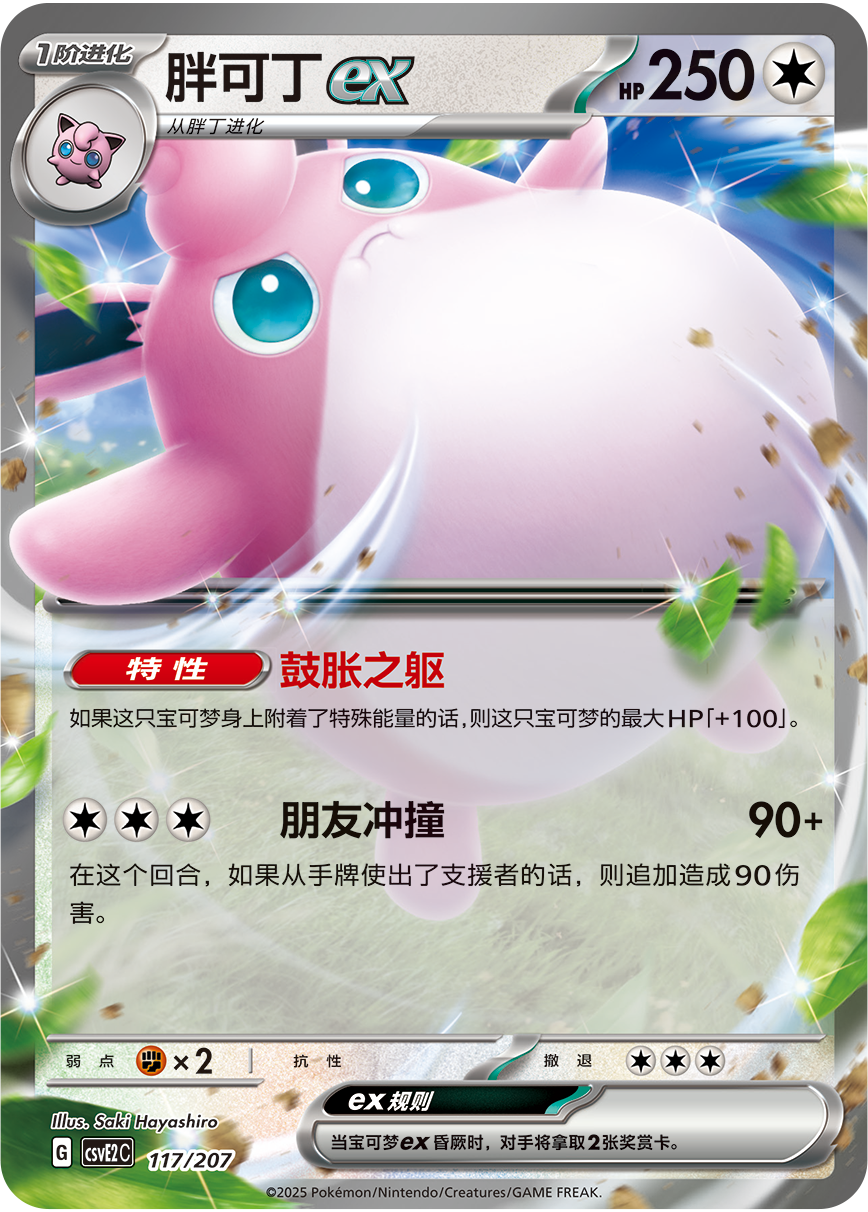 胖可丁ex的特性“鼓胀之躯”可以在这只宝可梦身上附着了特殊能量的情况下,使其最大HP加100。招式“朋友冲撞”,让其在这个回合,如果从手牌使出了支援者的话,则追加造成90伤害!在增加自己的HP难以被轻松昏厥的同时,给对手造成可观的伤害,真是让对手头疼的存在!