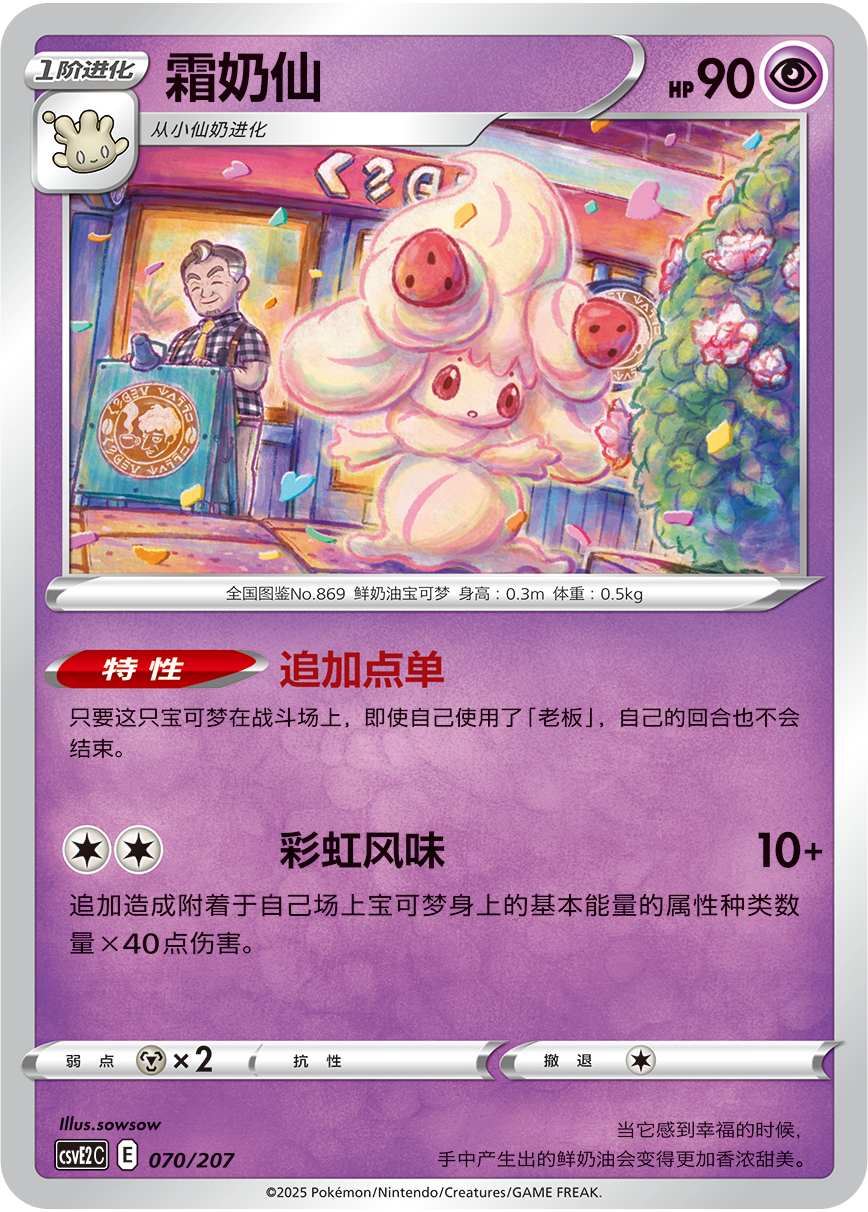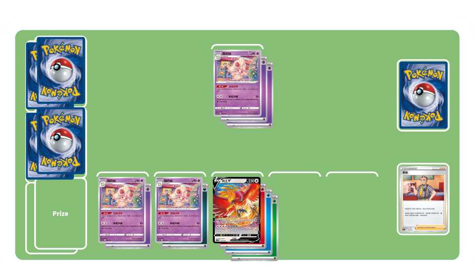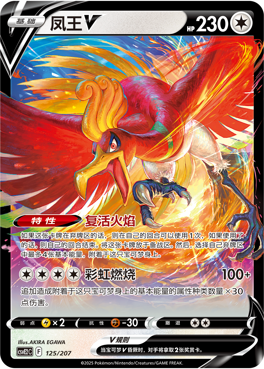 凤王V的招式“彩虹燃烧”可以追加造成附着于这只宝可梦身上的基本能量的属性种类数量×30伤害。通过支援者卡“老板”和霜奶仙的特性“追加点单”的搭配,一回合附着更多属性种类的基本能量给自己的宝可梦,造成更高的伤害。