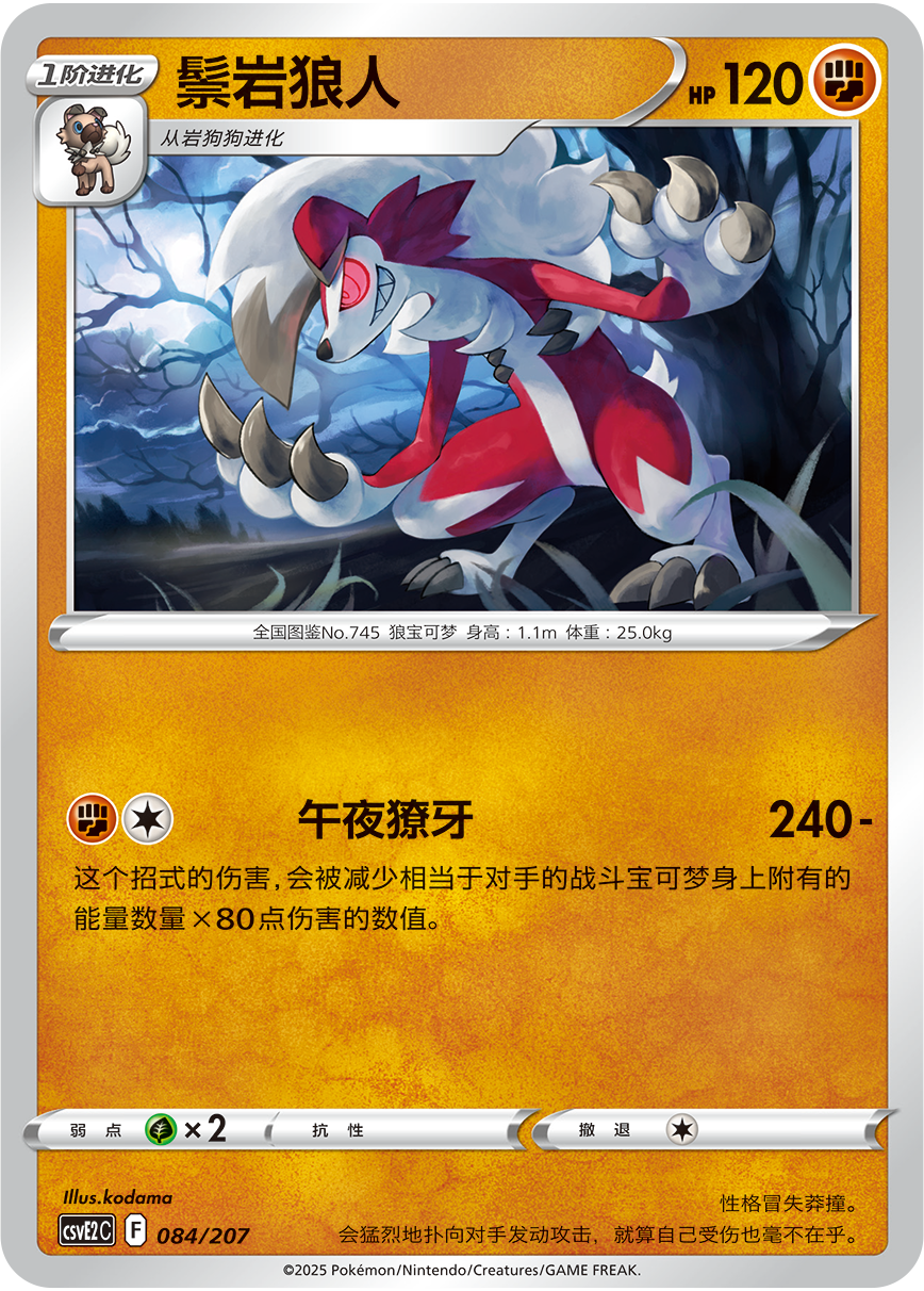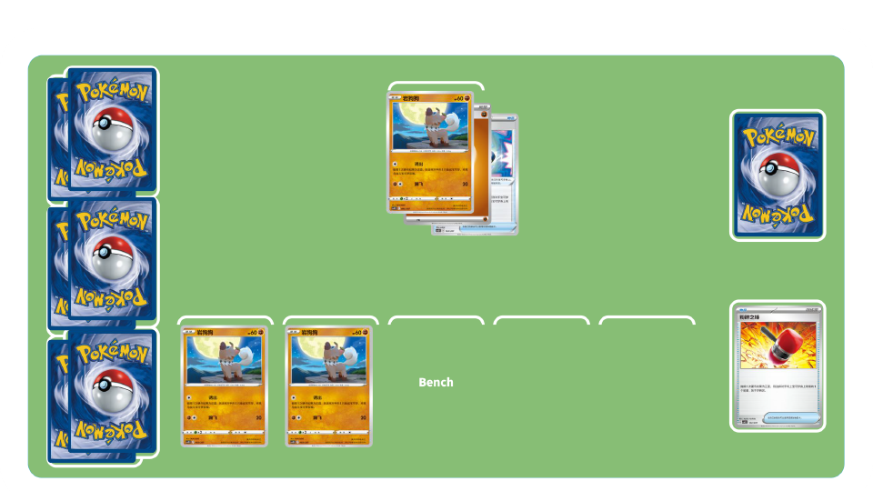 粉碎!獠牙和复仇拳斗卡组-初期:进化鬃岩狼人,为其附着能量,鬃岩狼人是初期核心,应积极使用各类物品卡,赶在对手为宝可梦附着能量前,迅速培养鬃岩狼人并发起进攻!物品卡“粉碎之锤”有机会将对手宝可梦附着的1个能量放到弃牌区。将宝可梦道具卡“粗硬头盔”放于战斗场的宝可梦身上,在其受到对手宝可梦的招式伤害时,选择使用招式的宝可梦附着的1个能量,放回对手的手牌。有效控制对手宝可梦附着的能量,就能让鬃岩狼人的招式伤害更高。