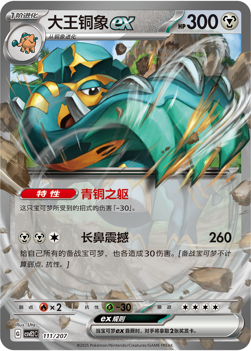 大王铜象ex作为1阶进化宝可梦,不仅拥有高达300的HP,特性“青铜之躯”还可以让其受到的伤害-30,让对手望而却步。支援者卡“也慈”,可以从牌库选择2张基本能量附着给自己的1只宝可梦。要注意,在使用了这张卡的回合结束前,自己的所有宝可梦都无法使用招式哦!