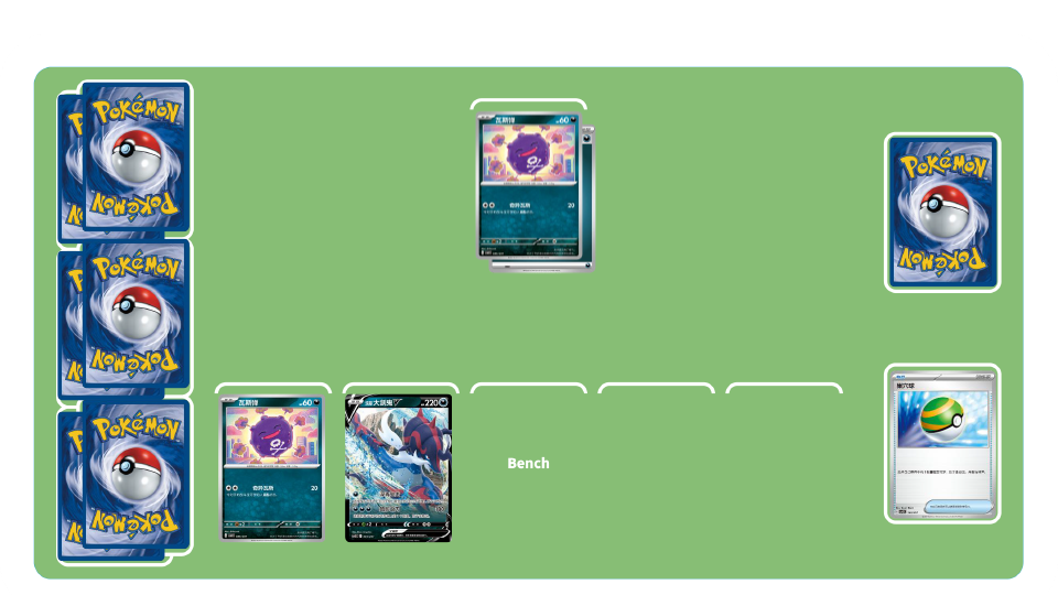 残忍之刃卡组-初期:使用物品卡“巢穴球”“高级球”找到瓦斯弹和洗翠大剑鬼V,并把它们放到备战区。优先给瓦斯弹附着能量吧!