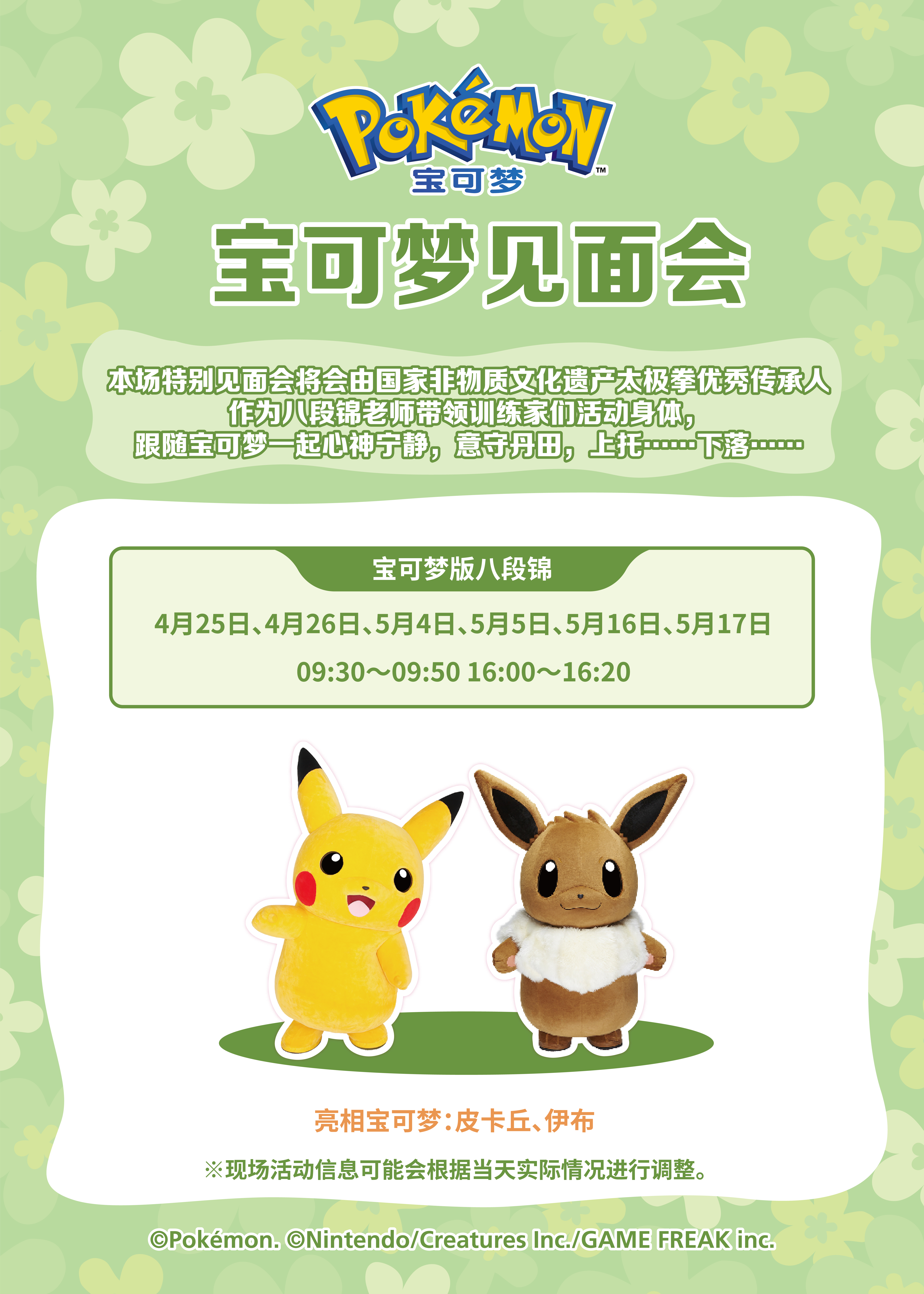 本场特别见面会将会由国家非物质文化遗产太极拳优秀传承人作为八段锦老师带领训练家们活动身体,跟随宝可梦一起心神宁静,意守丹田,上托……下落……