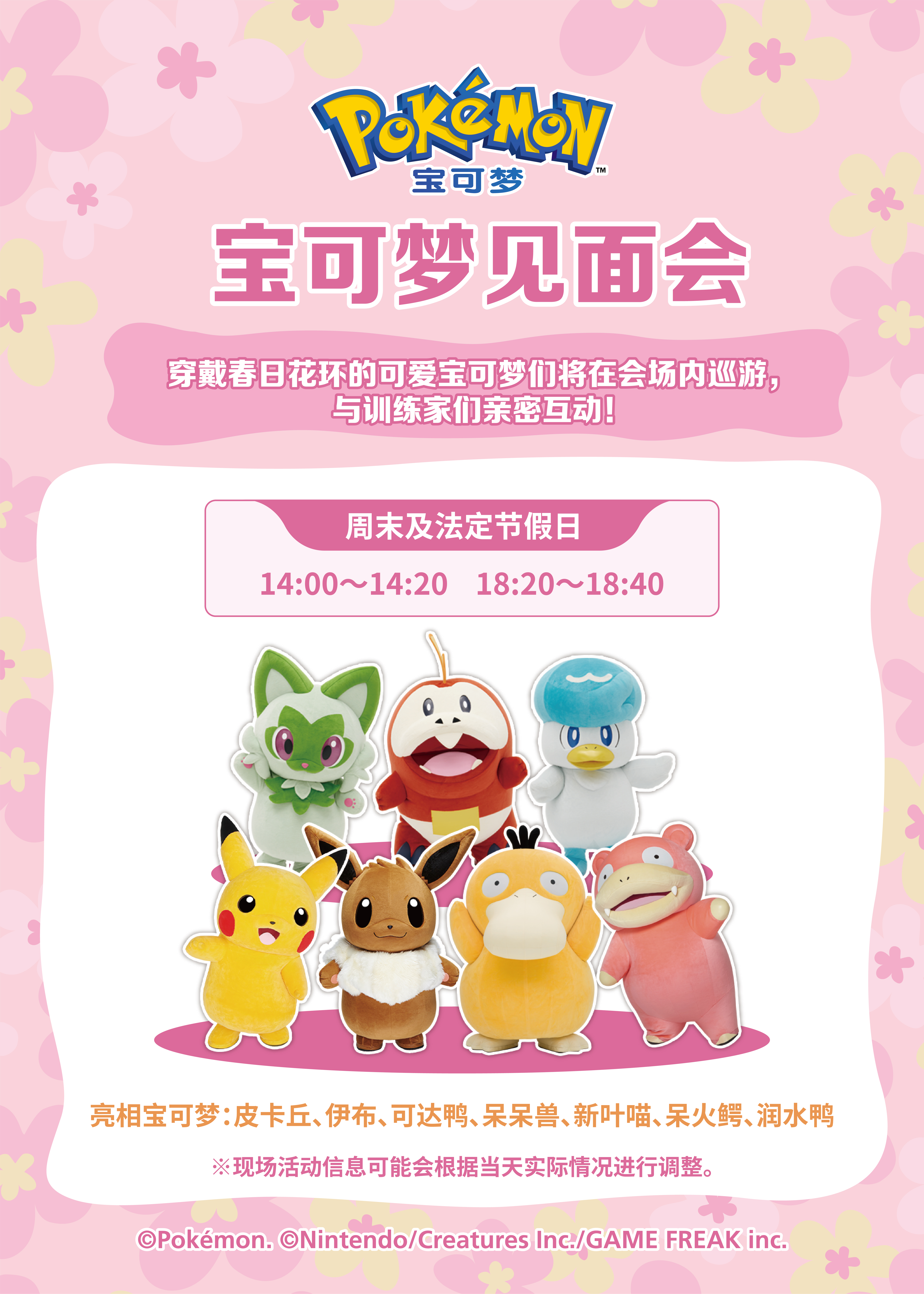 周末及节假日,穿戴春日花环的可爱宝可梦们也将在会场内巡游,与训练家们亲密互动!