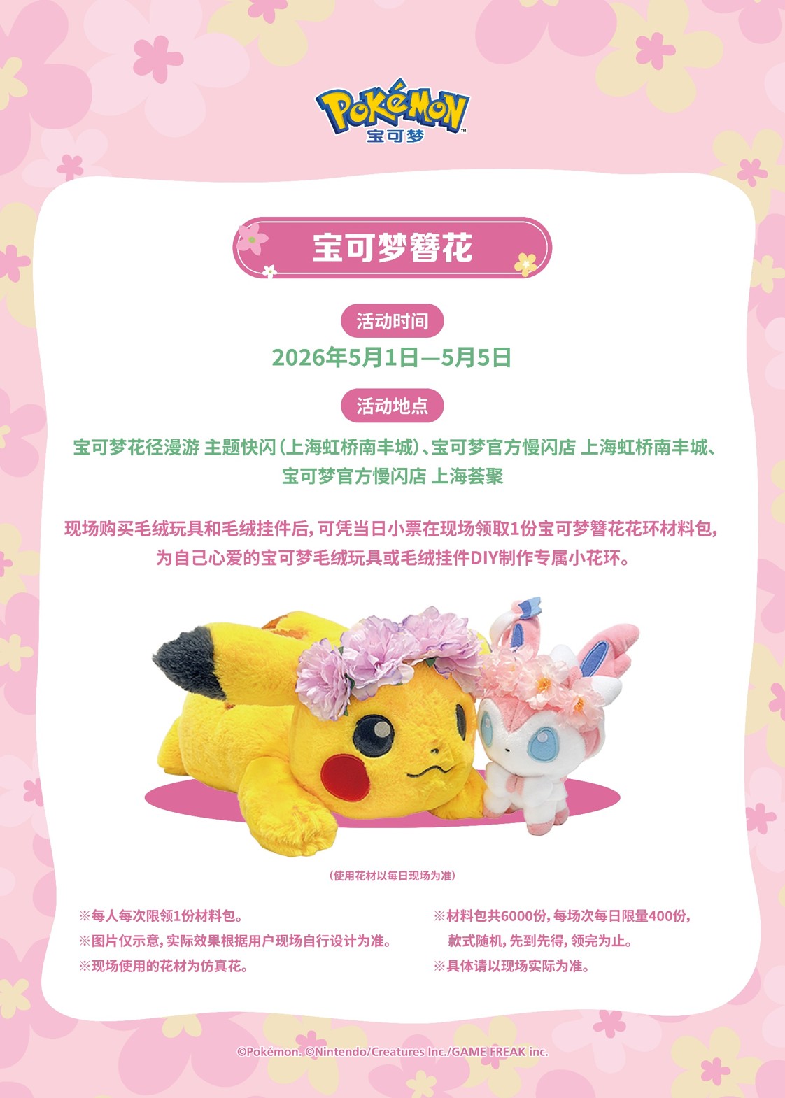 活动内容:现场购买毛绒玩具和毛绒挂件后,可凭小票在现场领取1份宝可梦簪花花环材料包,为自己心爱的宝可梦毛绒玩具或毛绒挂件DIY制作专属小花环。