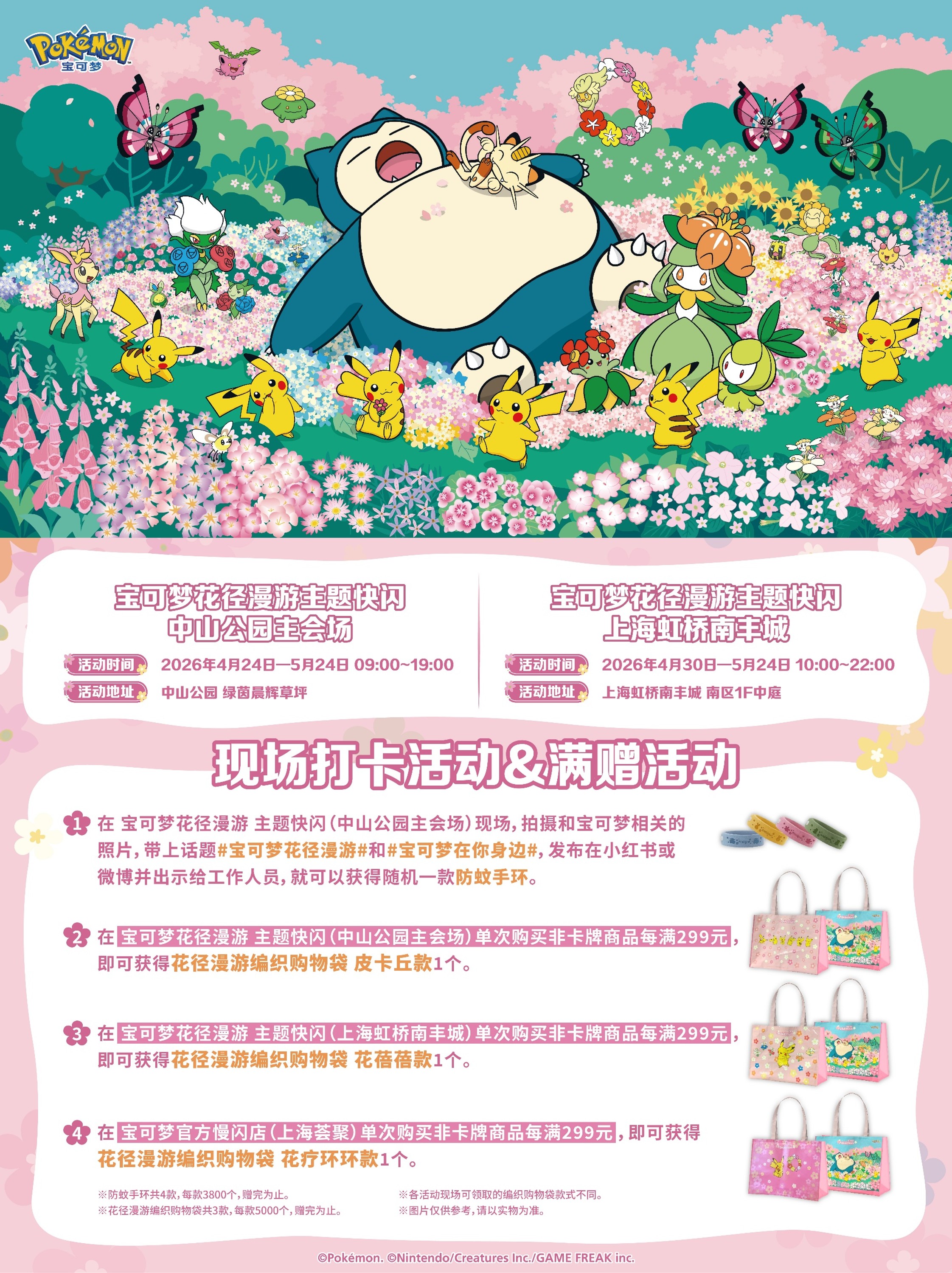 在宝可梦花径漫游主题快闪(中山公园)、宝可梦花径漫游主题快闪(上海虹桥南丰城)及宝可梦官方慢闪店(上海荟聚)现场不仅能与缤纷多彩的宝可梦相遇,记录下美好时刻还有机会得到防蚊手环,还有宝可梦簪花活动等你来体验!