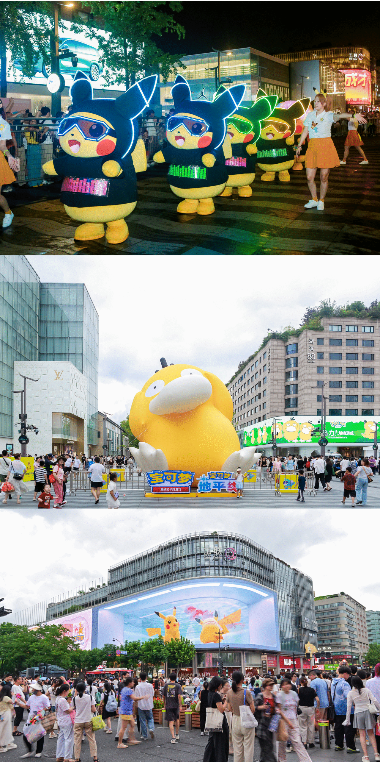 图5:宝可梦巡游、可达鸭巨型气模及杭州西湖天幕播放的宝可梦卡牌品牌宣传片