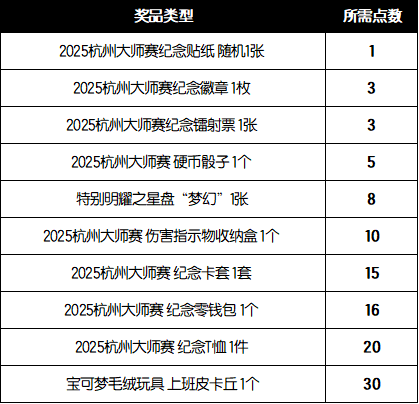 参加大师赛现场的部分宝可梦卡牌场外活动或嘉年华活动将有机会获得杭州大师赛现场点数,训练家可通过积累点数在现场兑换相应的礼品,更有杭州大师赛专属礼品等你来拿!