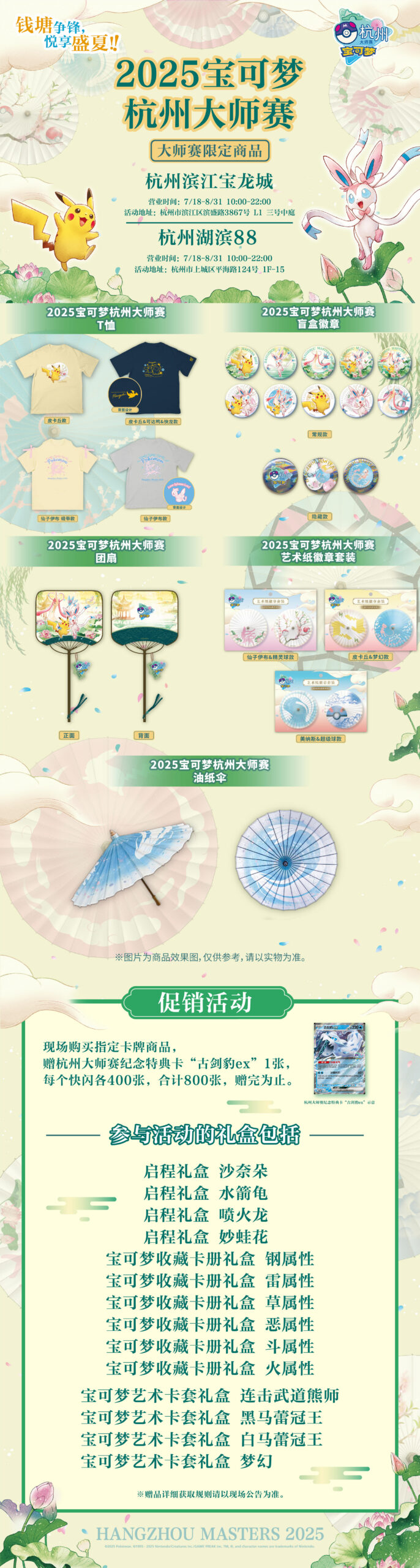 杭州大师赛主题部分周边商品将在7月18日于宝可梦官方旗舰店 收集啦151主题快闪 (杭州滨江宝龙城) 、宝可梦官方旗舰店 念力!烦恼消散主题快闪 (杭州湖滨88) 提前与训练家们见面!