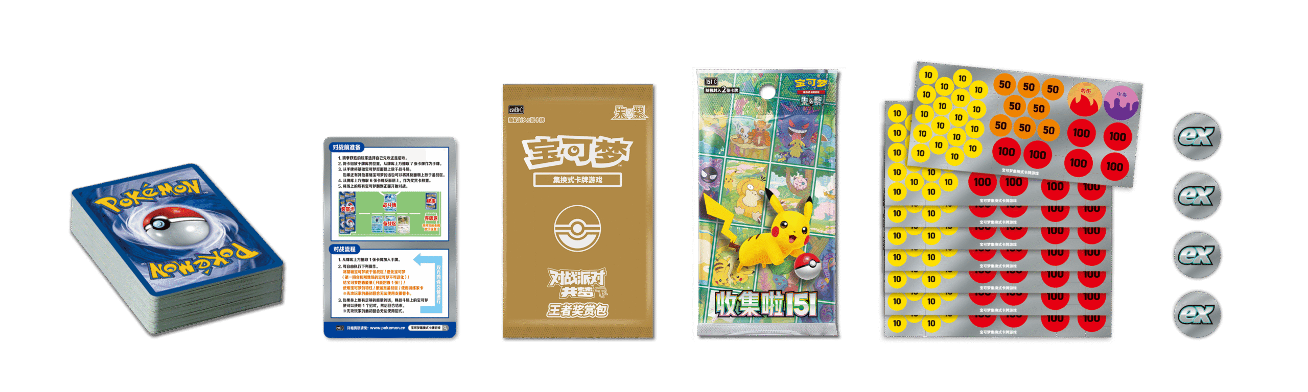 “对战派对 共梦 下”内含8套纸质伤害指示物,可供8人同时使用。召集朋友们打开“对战派对 共梦 下”,就可以立即开始愉快的对战派对。优胜者有资格获得商品中包含的“王者奖赏包”。还有20包“收集啦151”活动包可以根据对战结果进行分配。相信自己的卡组,努力争取最终的胜利吧!