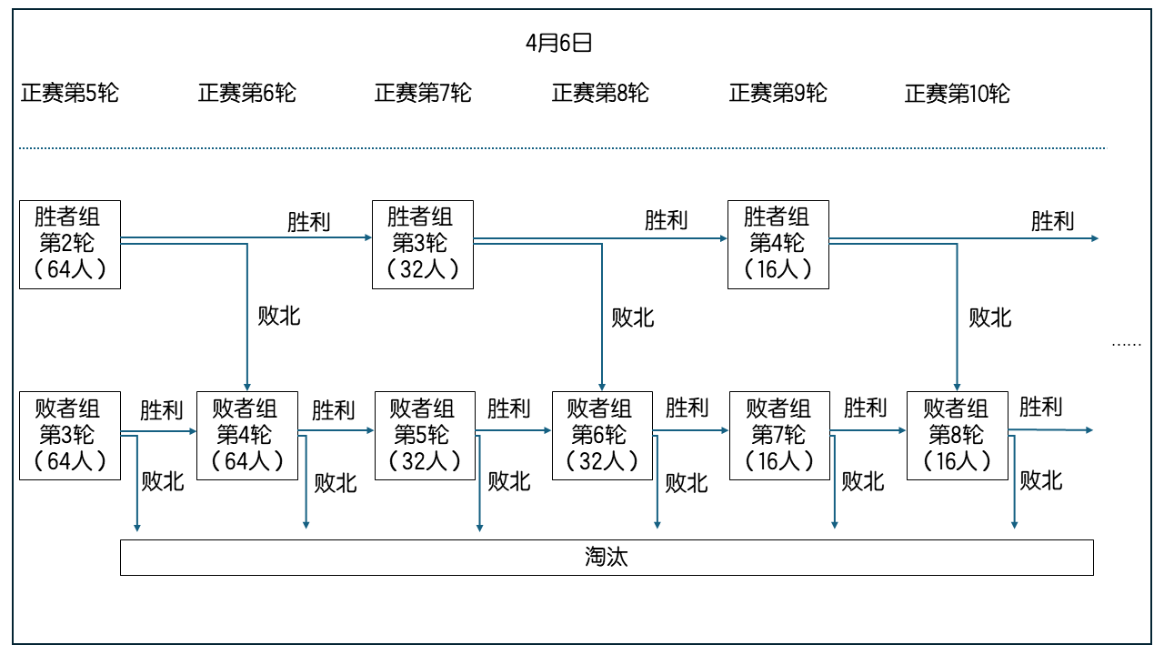 进入胜者组的选手将继续配对进行对局。每轮对局的胜者将留在胜者组,败者将按照对应轮数进入败者组,直至胜者组仅剩1人(即胜者组冠军)。胜者组预计共进行7轮对局。