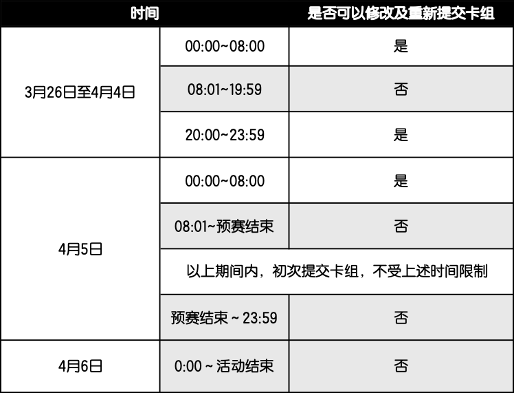 开启报名后至4月5日8:00,训练家可在每日20:00至次日8:00修改及重新提交卡组。
