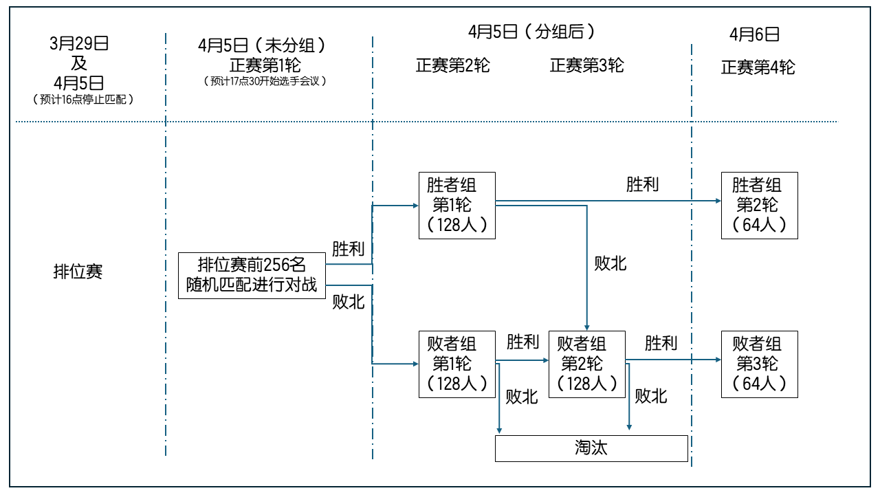 本次公开组正赛采用双败淘汰制的比赛形式。晋级正赛的256名选手将以随机的方式进行配对,获胜的128名进入胜者组,败北的128名进入败者组。胜者组及败者组每轮对局都将以随机的方式进行配对。