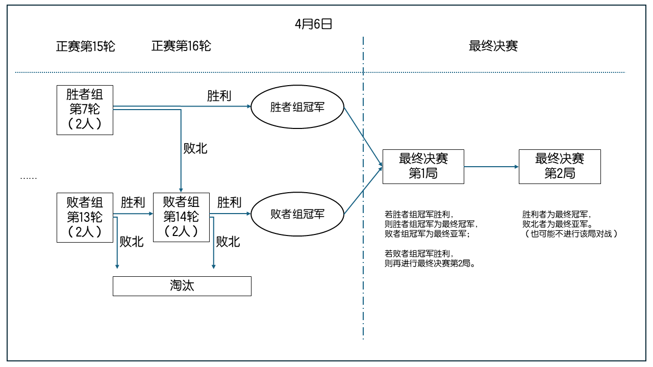 胜者组冠军将与败者组冠军进行最终决赛。如胜者组冠军获得对局胜利,则为最终获胜。如败者组冠军获得对局胜利,则需再取得一场对局胜利,方可最终获胜。