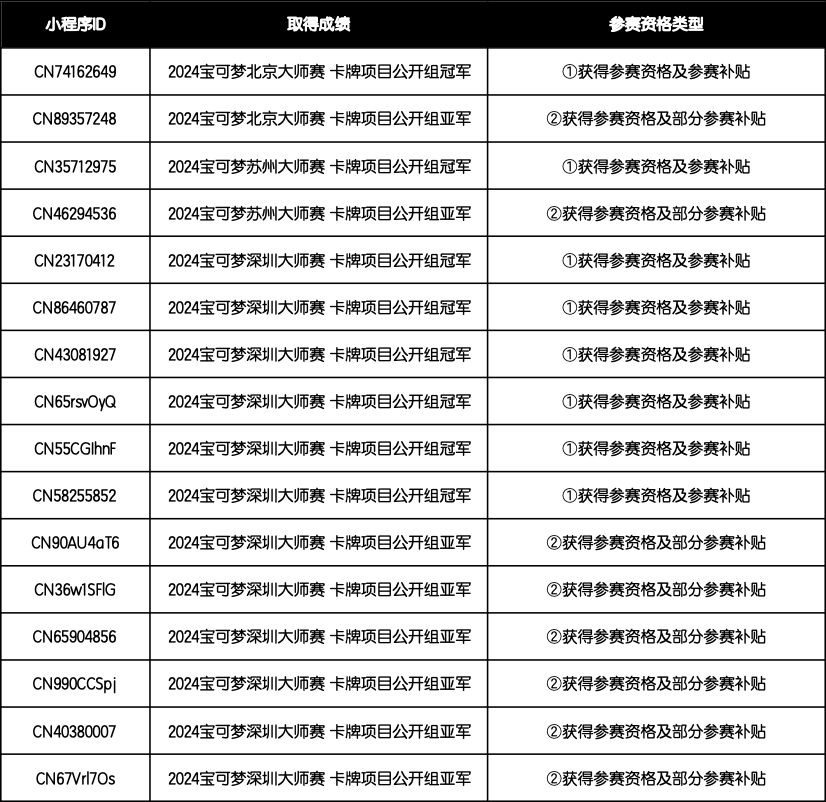 有关“世界锦标赛”具体举办时间、地点、赛制等更多赛事信息将后续公布,请关注宝可梦官方发布信息。有关邀请函的提供时间和补贴等更多详情也将陆续由宝可梦卡牌会员小程序客服联系,请获得资格的选手注意查收通知。