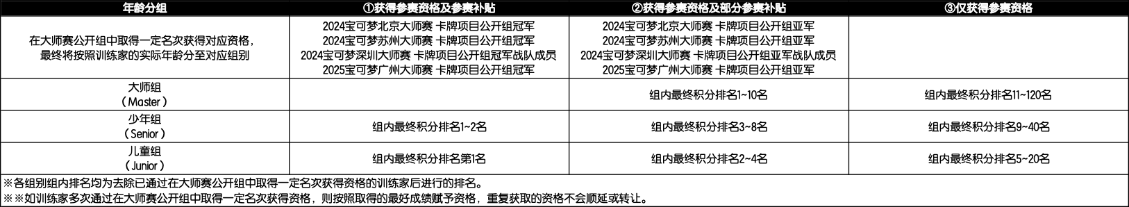 少年组(Senior):出生年份为2009、2010、2011、2012年的训练家。