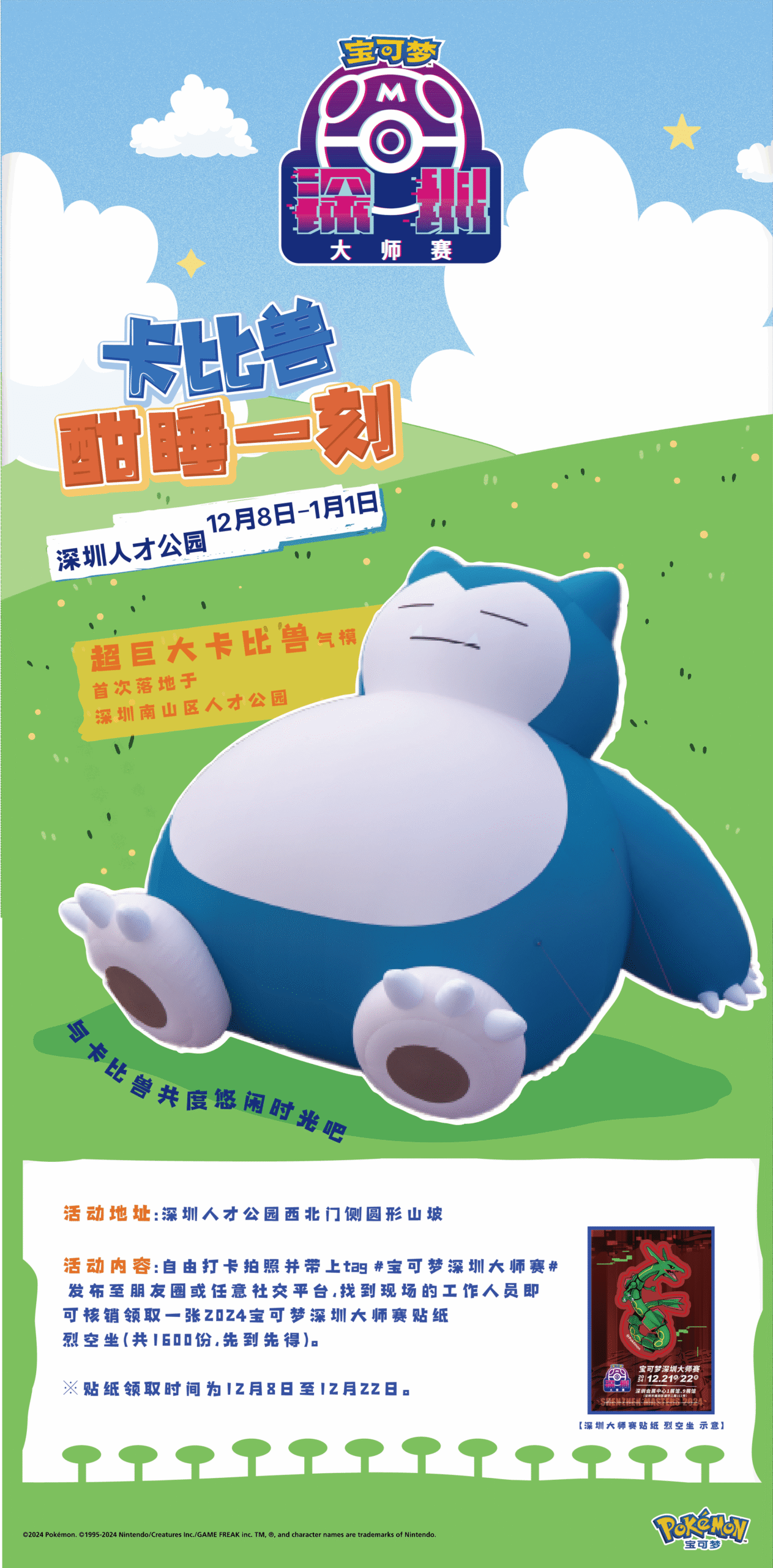 活动内容:自由打卡拍照并带上tag #宝可梦深圳大师赛# 发布至朋友圈或任意社交平台,找到现场的工作人员即可核销领取一张“2024宝可梦深圳大师赛贴纸 烈空坐”(共1600份,先到先得)。