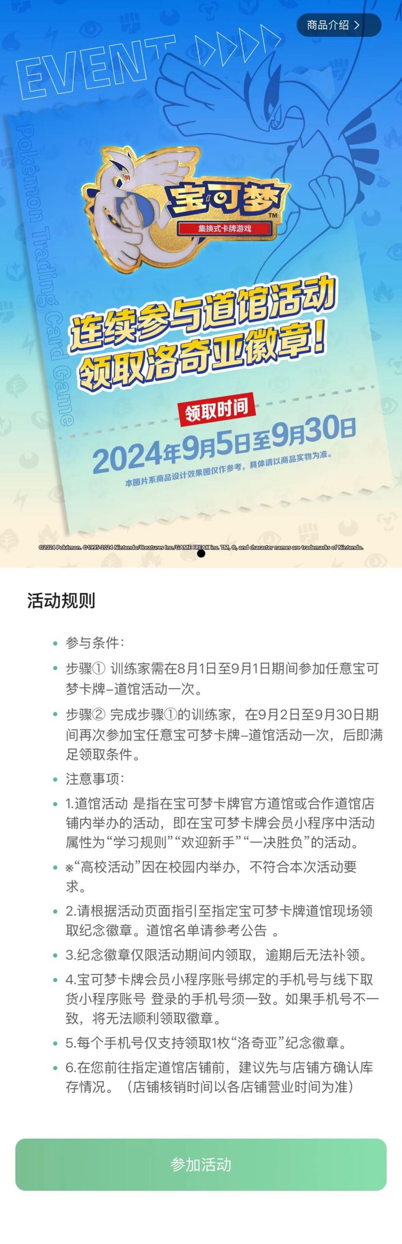 2024年8月1日起至9月30日止,训练家参加宝可梦卡牌道馆活动且满足条件后即可获得“洛奇亚”精美纪念徽章一枚。