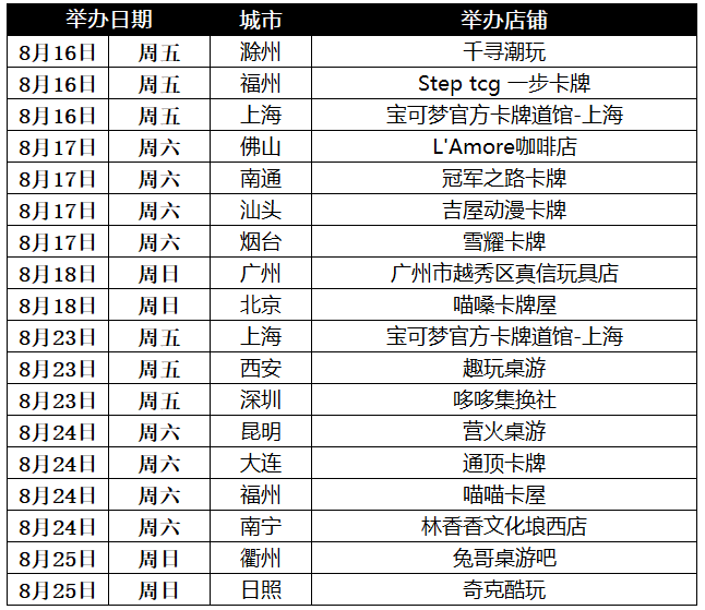 8月16日~8月25日期间场次的报名将于8月13日18:00:00—8月14日23:59:59开启。训练家可于8月15日在小程序上自行查看报名结果。后续比赛的报名时间请关注官方信息。