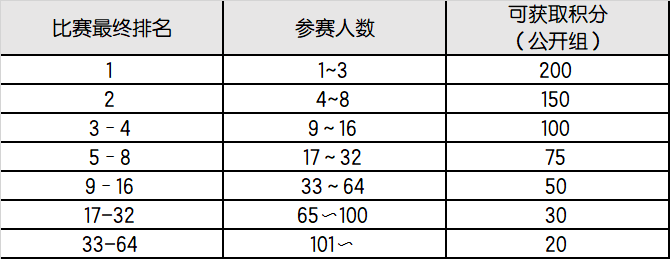 ※可获取的积分依据当场比赛的实际参赛人数及比赛最终排名来决定。