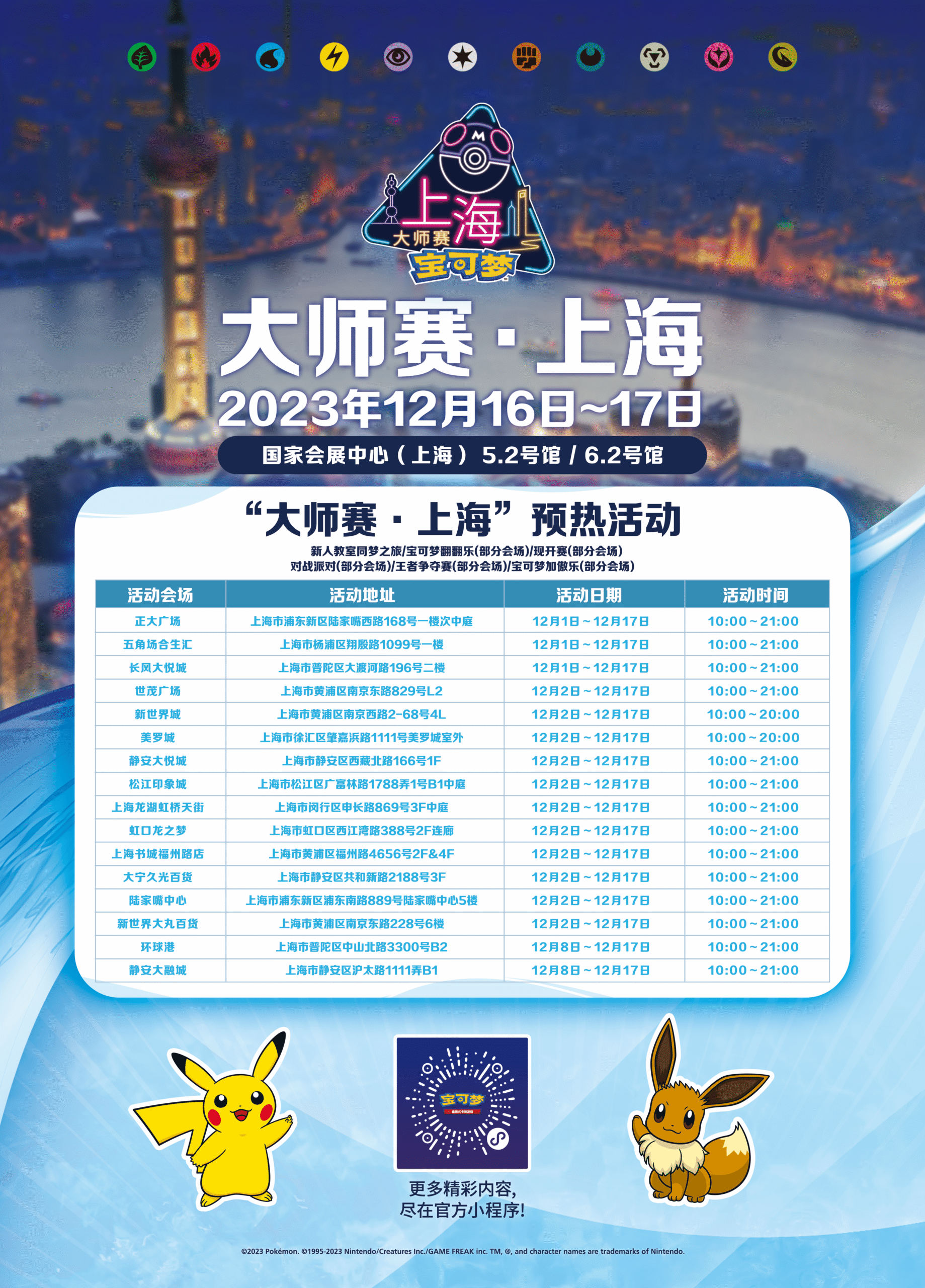 “2023宝可梦卡牌大师赛·上海”(以下简称“大师赛·上海” )将于12月16日~17日在国家会展中心(上海)5.2号馆&6.2号馆举办。 12月1日起也将在上海各地举办预热活动。