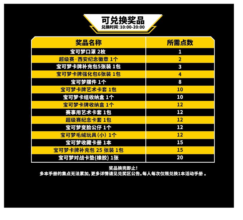 在超级赛·西安各组比赛获得一定胜场数或正赛取得一定名次,或宝可梦卡牌场外活动将有机会获得超级赛·西安现场点数,训练家可通过积累点数在现场“场外赛兑奖处”兑换相应的礼品,更有超级赛专属礼品等你来拿!
