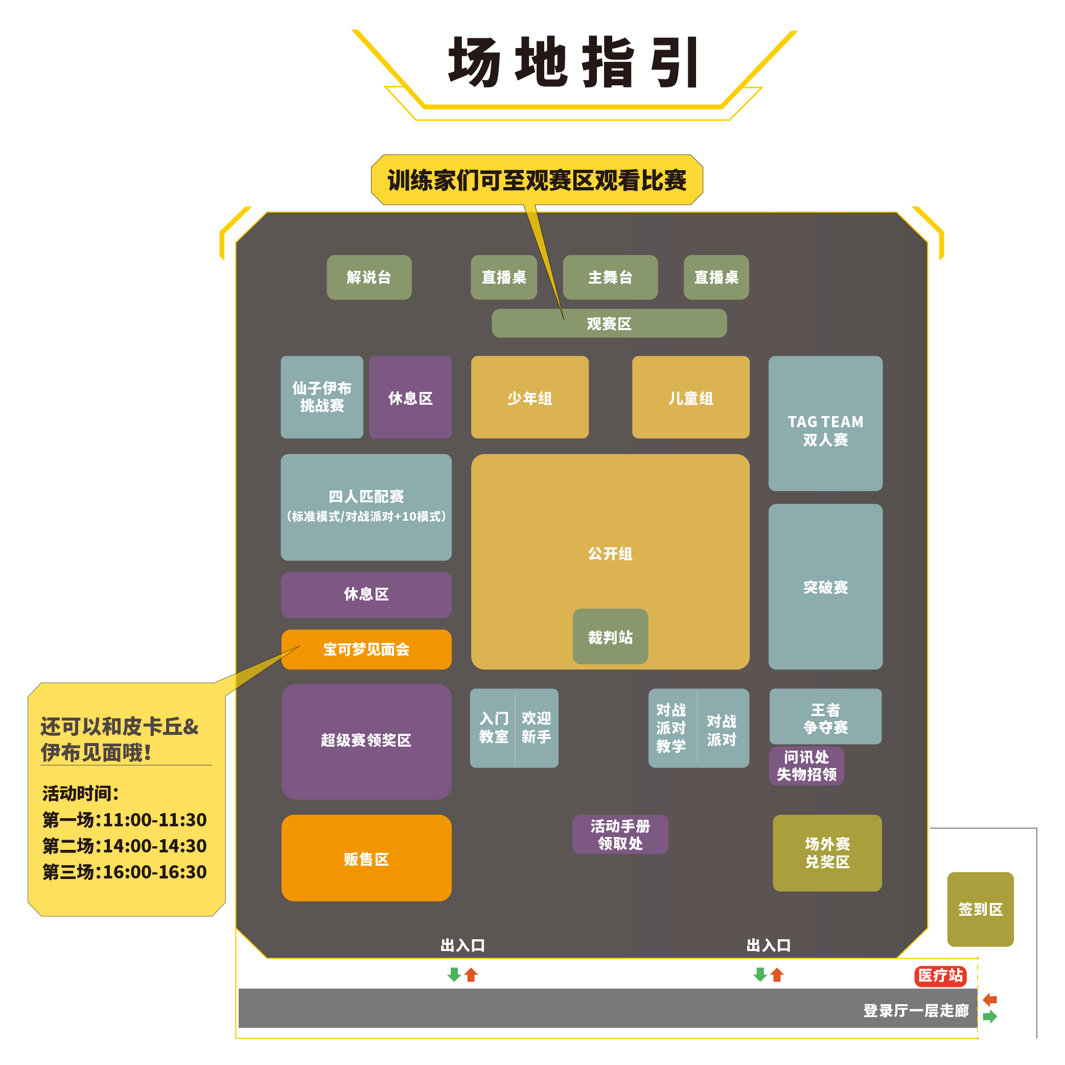 公开组线上报名成功的训练家及于预选赛获得资格的训练家、少年组线上报名成功的训练家,均需于8:00~9:00进入会场。超过规定入场时间后,即使拥有参赛资格,也无法核销入场。