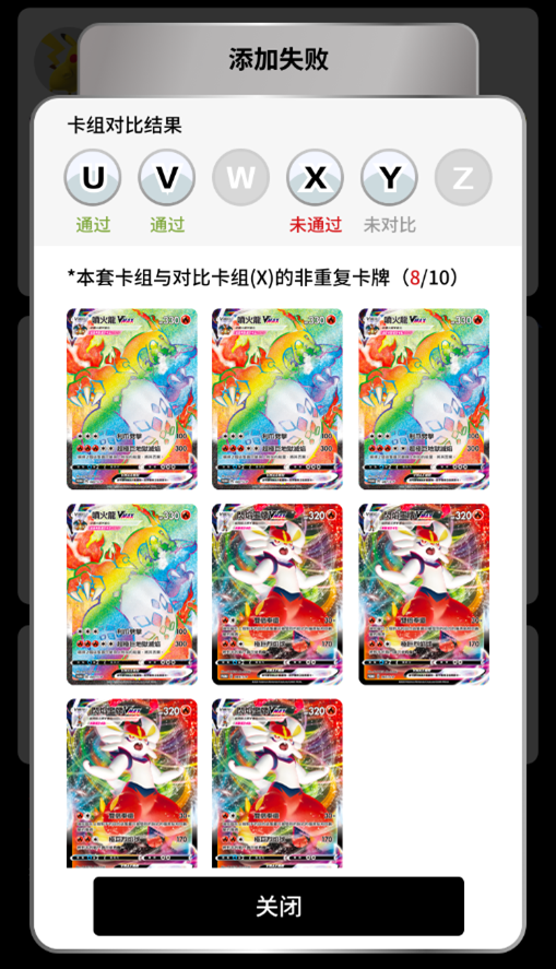 ※当有成员提交卡组后,新提交的卡组会与已提交的卡组进行对比。若新提交的卡组中未被已提交卡组采用的卡牌不足10张,提交成员的界面会显示“添加失败”,并提示与对比卡组的非重复卡牌(如下图1),届时请战队成员内部协商,自行对已提交或新提交的卡组进行调整来满足团队赛参赛卡组要求。
