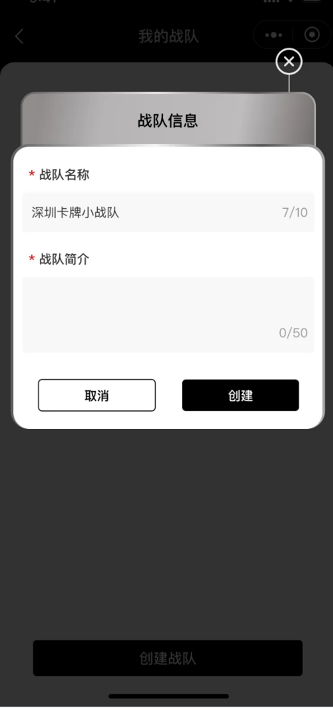 3.1.1输入你的战队名称及简介,点击“创建”按钮即可创建战队。