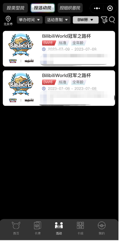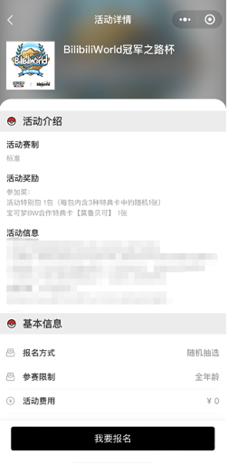 宝可梦卡牌与BilibiliWorld合作的大型赛事活动【BilibiliWorld冠军之路杯】正在火热报名中!本次赛事分为预选赛及最终淘汰赛,预选赛将在北京、上海、广州、深圳、杭州、南京、成都和武汉八个城市展开。最终淘汰赛则将于BilibiliWorld现场举行。【BilibiliWorld冠军之路杯】预选赛采取线上报名形式。6月21日19:00:00至6月28日23:59:59,训练家可通过微信小程序“宝可梦卡牌会员”进行线上报名。报名入选采取随机抽选的机制,我们将从每场的报名者中随机选出至多400名(北京场次为每场至多200名)训练家赋予参赛资格。抽选结果将于2023年6月29日(周四)通过小程序通知。本次赛事也将开放一定数量的现场补录名额。现场补录将采取随机抽选的方式。※有关现场补录详情请咨询各活动举办店铺或BilibiliWorld园长(https://bw.bilibili.com/#/bw)
